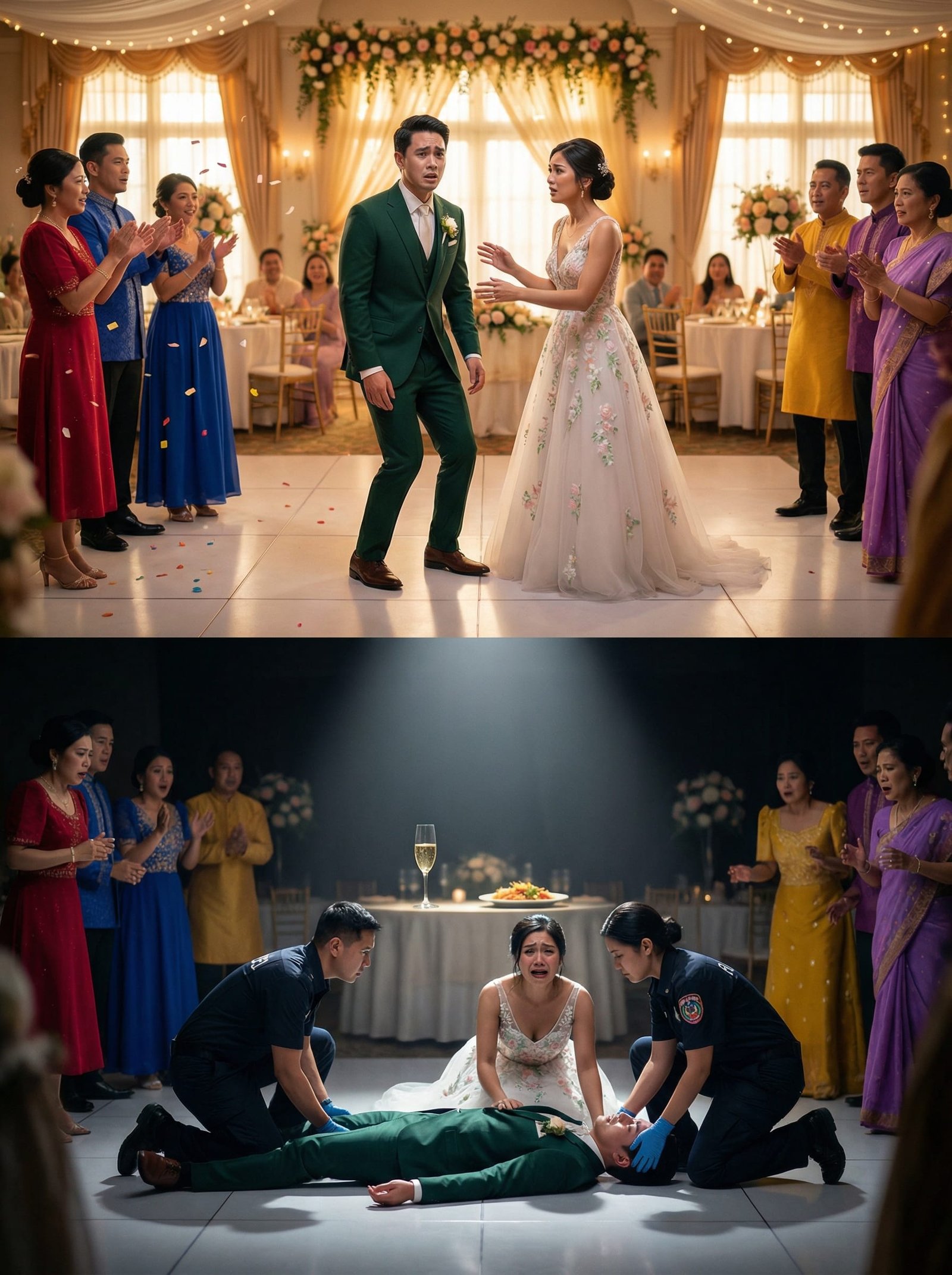 May dalawang paramedic na nasa event (dahil may VIP na bisita) ang mabilis na lumapit. Sinimulan nila ang CPR. May nag-announce na “Please give space!” pero ang mga mata ng lahat, nakapako sa bagong kasal na nakahandusay.