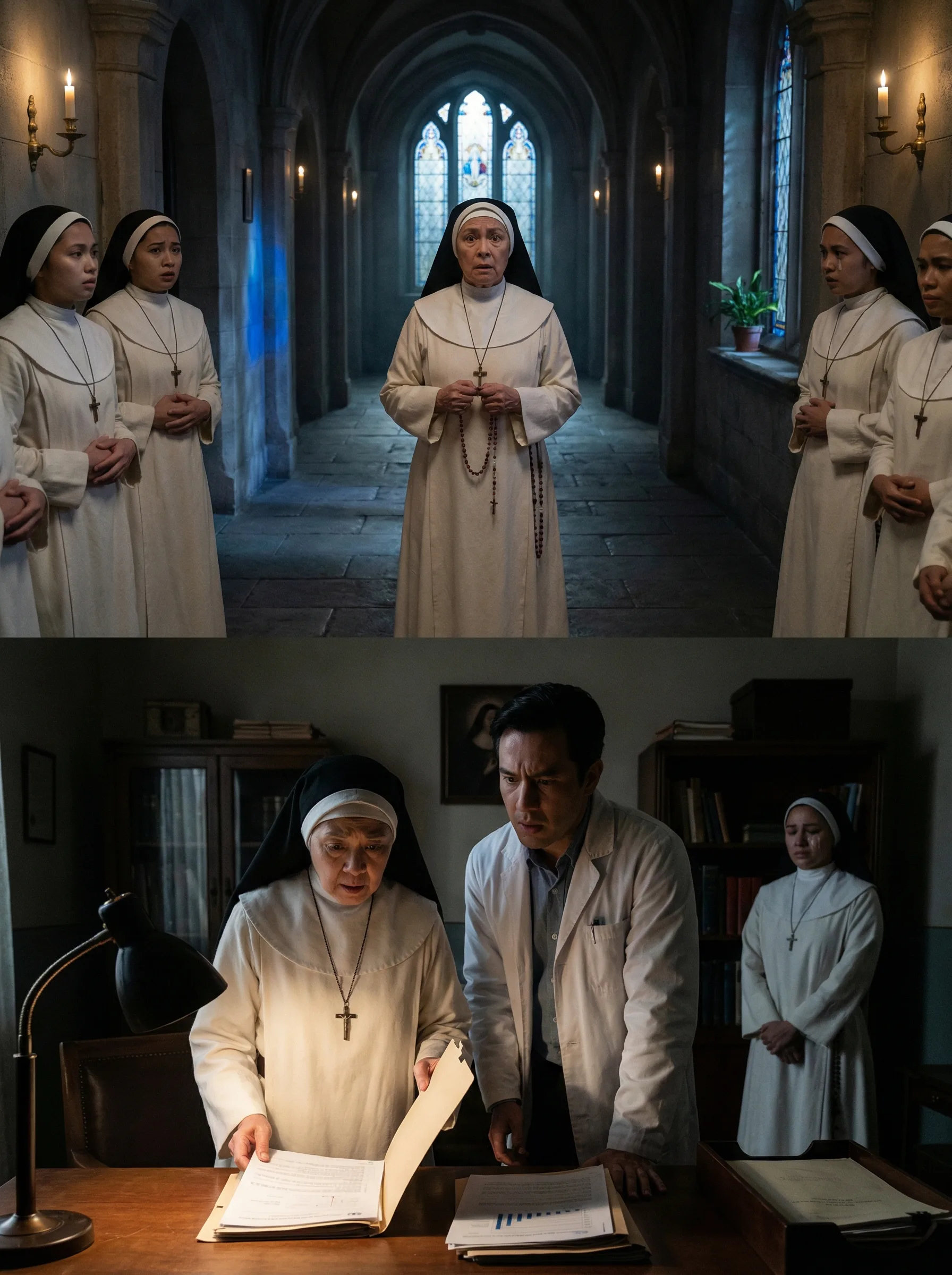 Sa loob ng kumbento, ramdam ang bigat. Si Mother Agnes, ang madre superiora, nakatayo sa gitna ng hallway. Nakapalibot sa kanya ang mga madre—lahat tahimik, pero halatang kinakabahan.