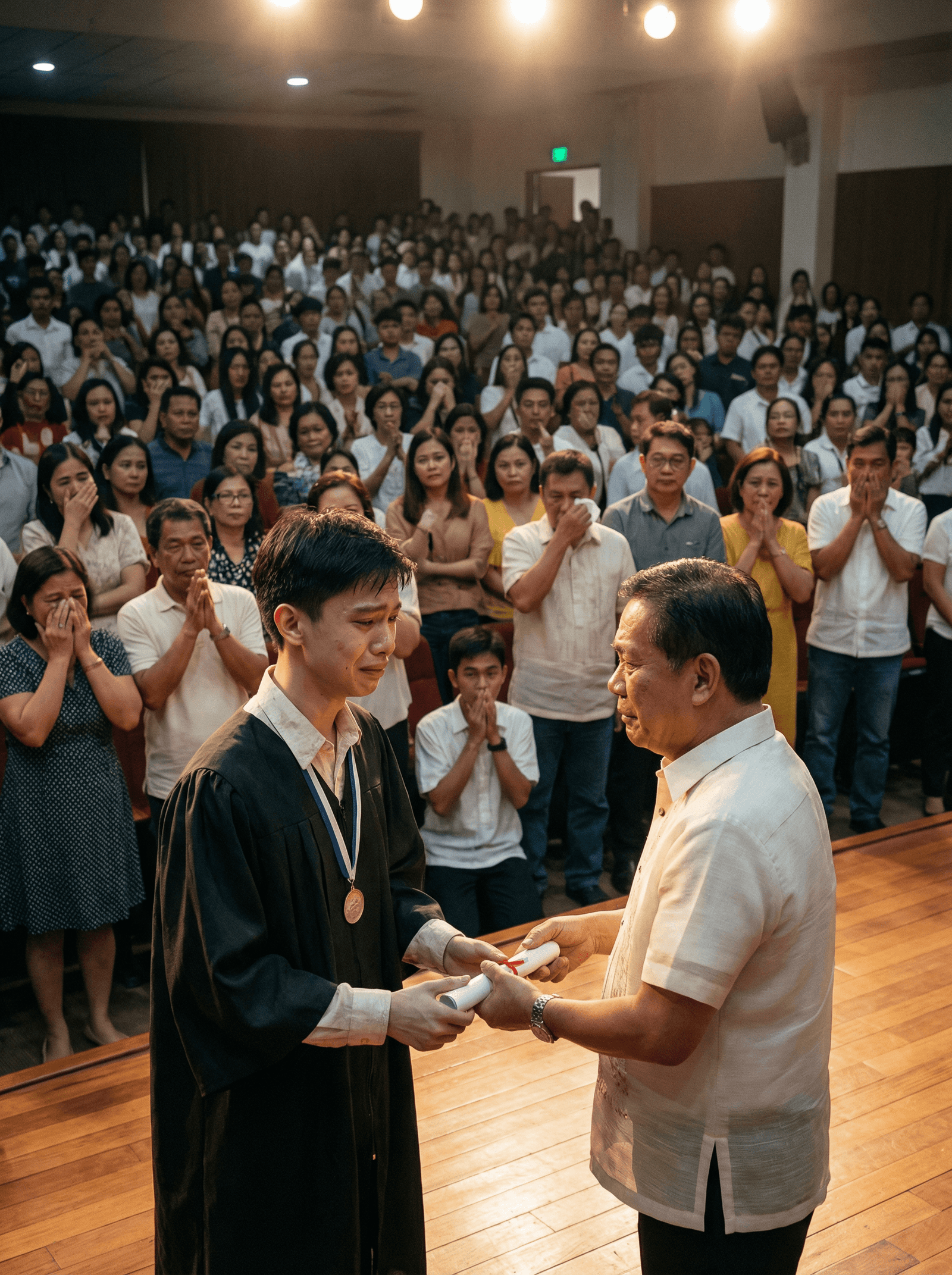 Palakpakan ang buong bulwagan, ngunit sa gitna ng ingay ay may isang katahimikang tumimo sa puso ng lahat: ang katotohanang may mga diploma palang hindi lang binabayaran ng matrikula, pagod, at oras—kundi ng dugo, lihim na sakripisyo, at pagmamahal ng anak sa magulang.