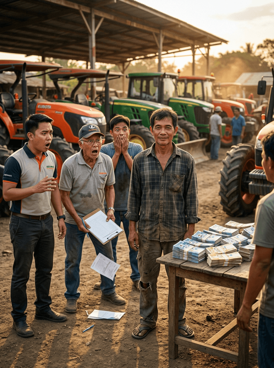 Sa malaking yard ng tractor dealership, nakahilera ang makikinang na makina—pula, berde, at kahel. May mga sales agent na naka-polo, may clipboard, at may ngiting pang-komisyon. Sa gitna ng alikabok, pumasok si Mang Doro—payat, nakapaldaang pantalon, kupas na plaid na long sleeves, at tsinelas na may putik pa.