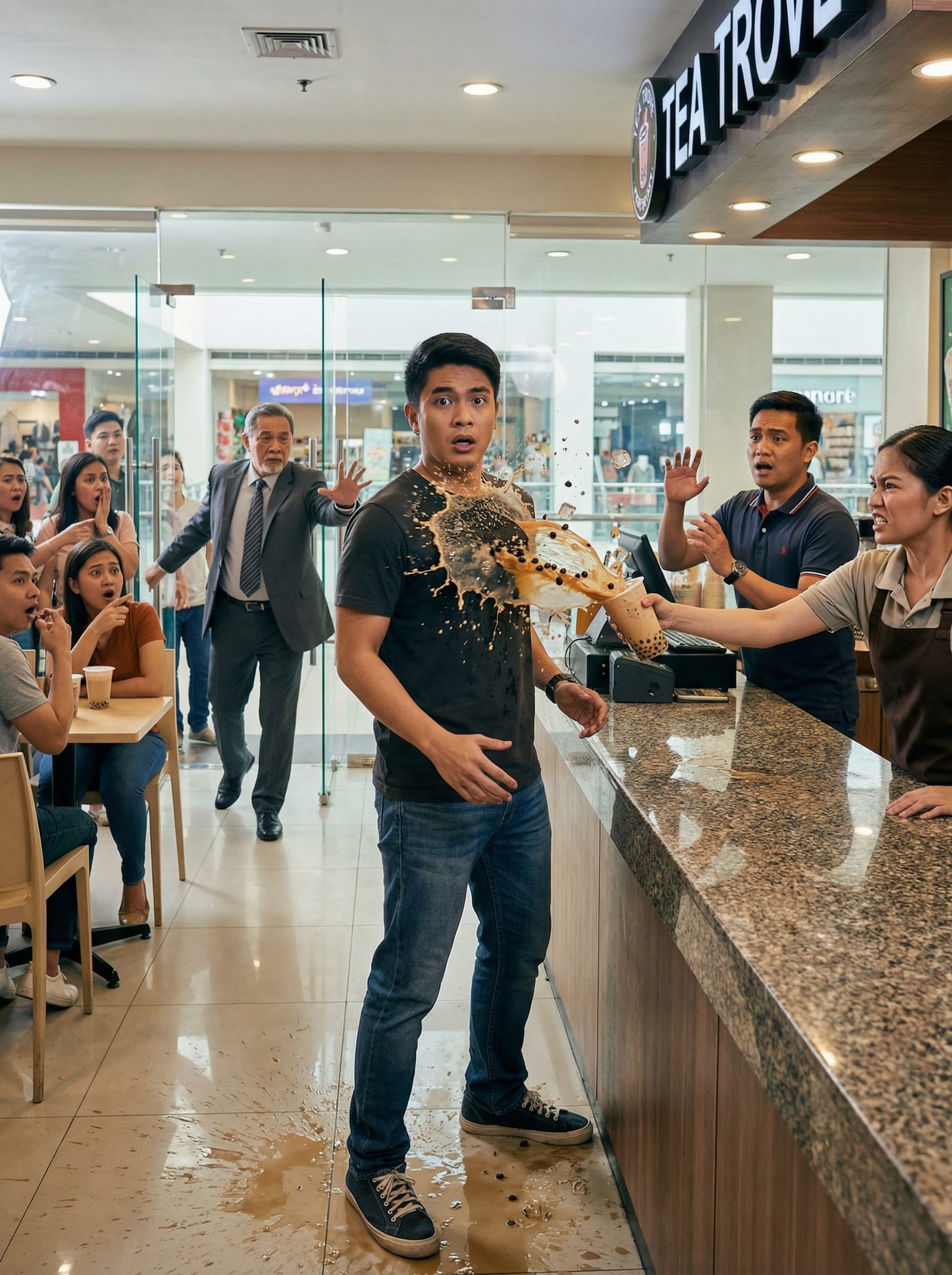 Tumahimik ang buong milk tea shop. Maging ang mga customer na kanina’y maingay at abala sa kani-kanilang usapan ay napatigil. Ang ilan ay napahawak sa bibig. Ang iba nama’y dali-daling naglabas ng cellphone, handang mag-record. Sa gitna ng lahat, nakatayo si Nathan, basang-basa ang harap ng kanyang damit, may tumutulong pearls at tsaa sa sahig, ngunit nananatiling kalmado ang mukha.