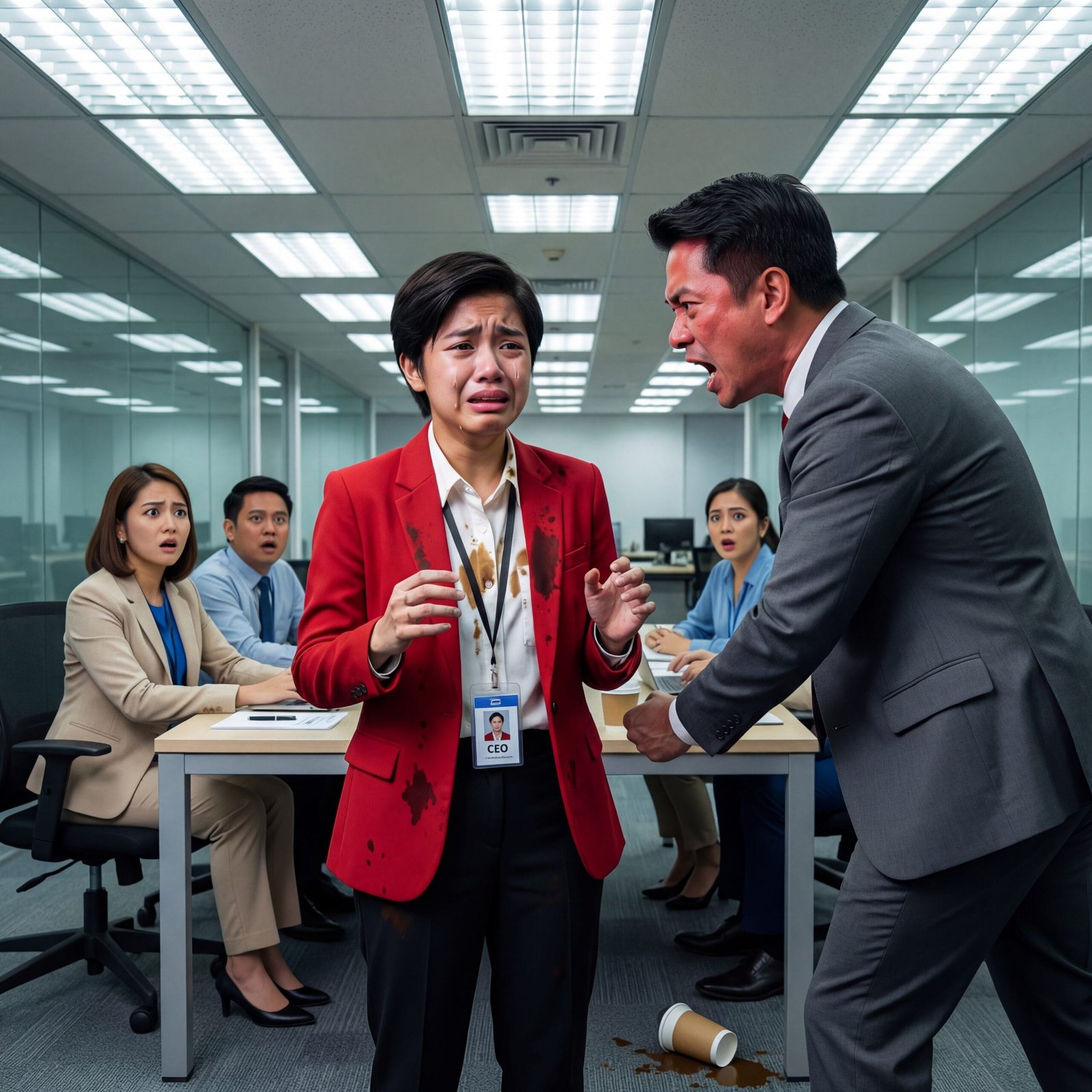 “URGENT?!” sigaw ni Garrido. Sa sobrang inis, hinablot niya ang baso ng kape sa mesa—yung bagong timpla, mainit pa—at sa isang iglap, bumuhos ang kape sa blazer ni Iris. Tumalsik hanggang dibdib. Nahulog ang papel sa kamay niya, kumalat ang brown envelope sa sahig.