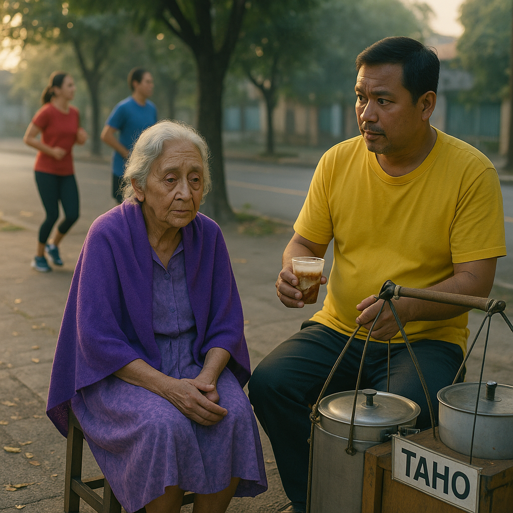 Hindi naglaon, napansin ko: mas dumarami ang ngumingiti sa may bangko. Kapag may tumigil, may libreng kalahating baso mula sa magtataho. Tinatawag namin iyong “Taho ni Lola”—matamis, pero sapat lang; malambot ang tokwa, parang haplos; at laging may iilang sago na parang maliliit na dasal sa dulo ng baso.