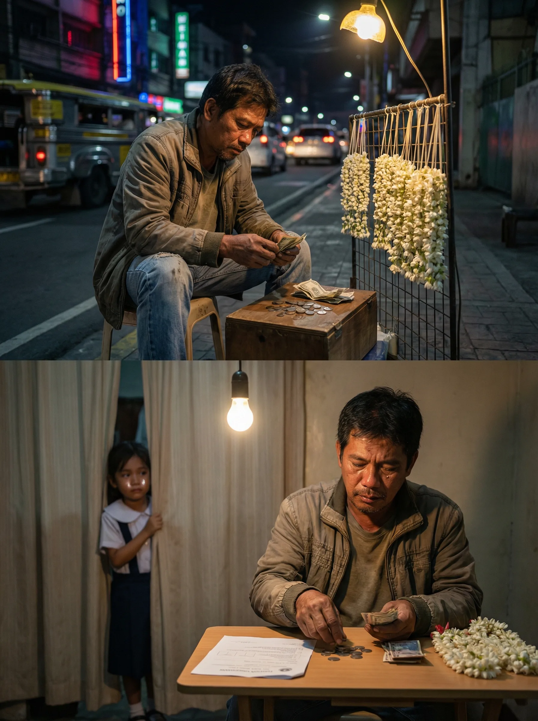 Basang-basa ang jacket niya, parang inulan. May mga sampaguita pang natira sa gilid. At sa ilalim ng ilaw ng bumbilya, nakita ko siyang binibilang ang kita.