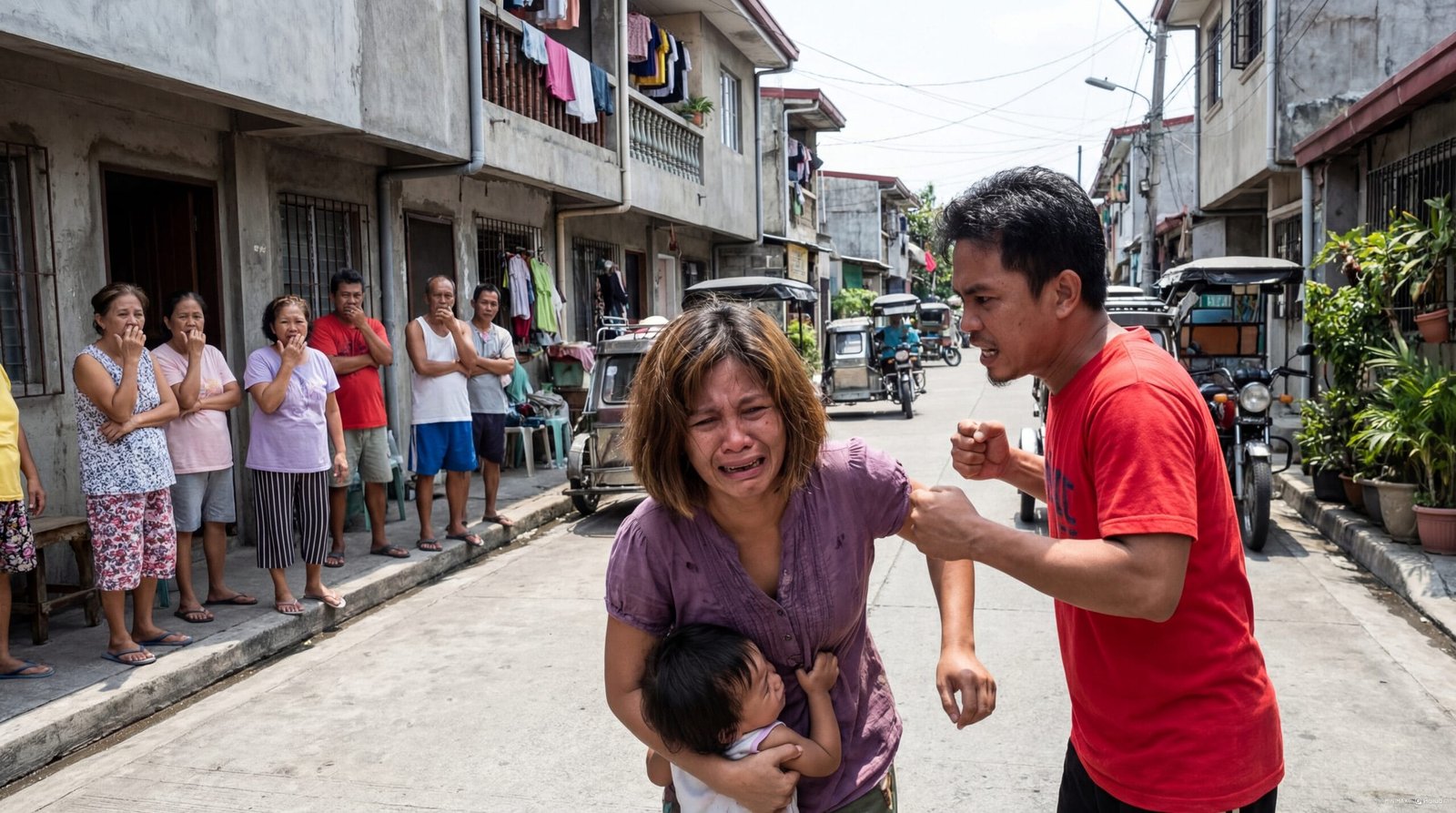Sa isang masikip na eskinita sa Caloocan, kung saan magkakadikit ang mga bahay at ang mga sinampay ay parang bandila ng bawat pamilya, kumalat ang ingay na parang apoy. Sa gitna ng kalsada, nakaluhod si MARA, basang-basa ng pawis at luha, yakap-yakap ang anak niyang si NICO—isang paslit na hindi pa marunong intindihin kung bakit nanginginig ang dibdib ng nanay niya.