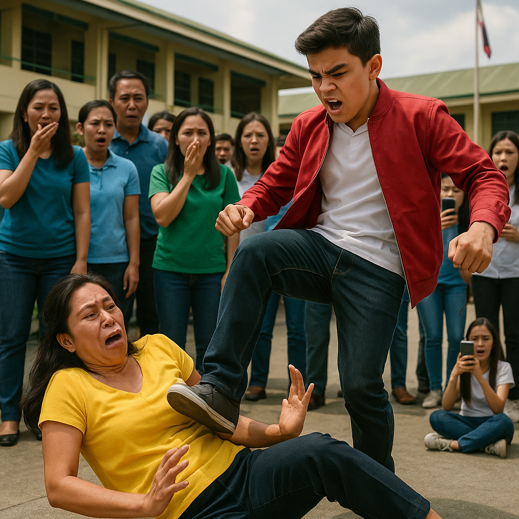 Itinaas niya ang paa, tila hindi na kontrolado, at sa harap ng naguguluhang mga estudyante—itinadyak niya sa tagiliran ng babaeng nakahandusay.