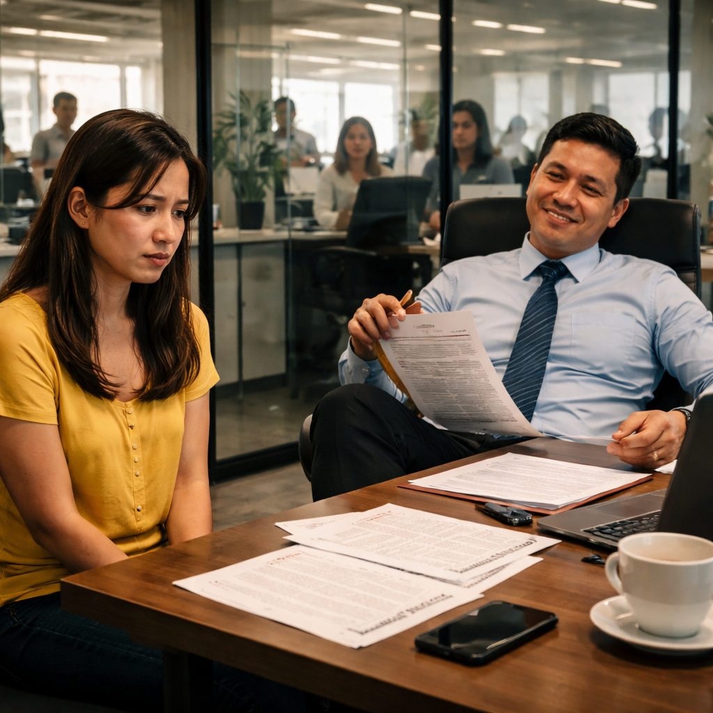 Sa harap niya, nakasandal sa swivel chair ang HR manager, nakangisi habang pinaglalaruan ang ballpen at papel na parang siya ang hukom sa korte.
