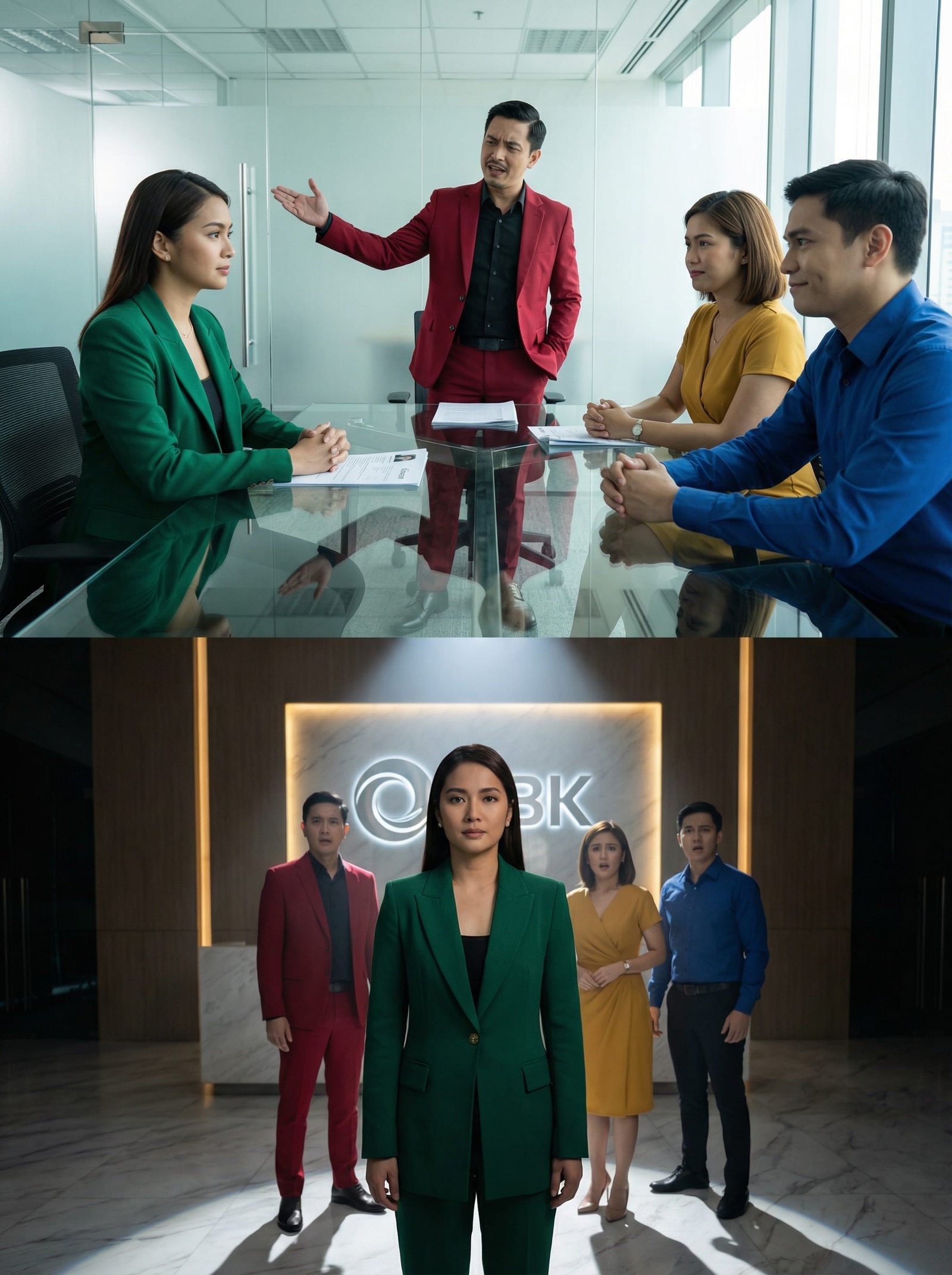 Tahimik ang conference room—salamin ang dingding, malamig ang aircon, at malinaw ang tunog ng orasan. Sa isang dulo ng mesa, nakaupo ang babae sa berdeng blazer—si Sofia Cruz—maayos ang postura, simple ang ayos, pero may matang kalmado na parang sanay sa bigat ng mundo. Sa kabilang dulo, nakatayo ang HR Manager na naka-pulang suit—si Mr. Dario Santos—malakas ang boses, mataas ang tingin sa sarili, at halatang gustong ipakita kung sino ang may kapangyarihan.