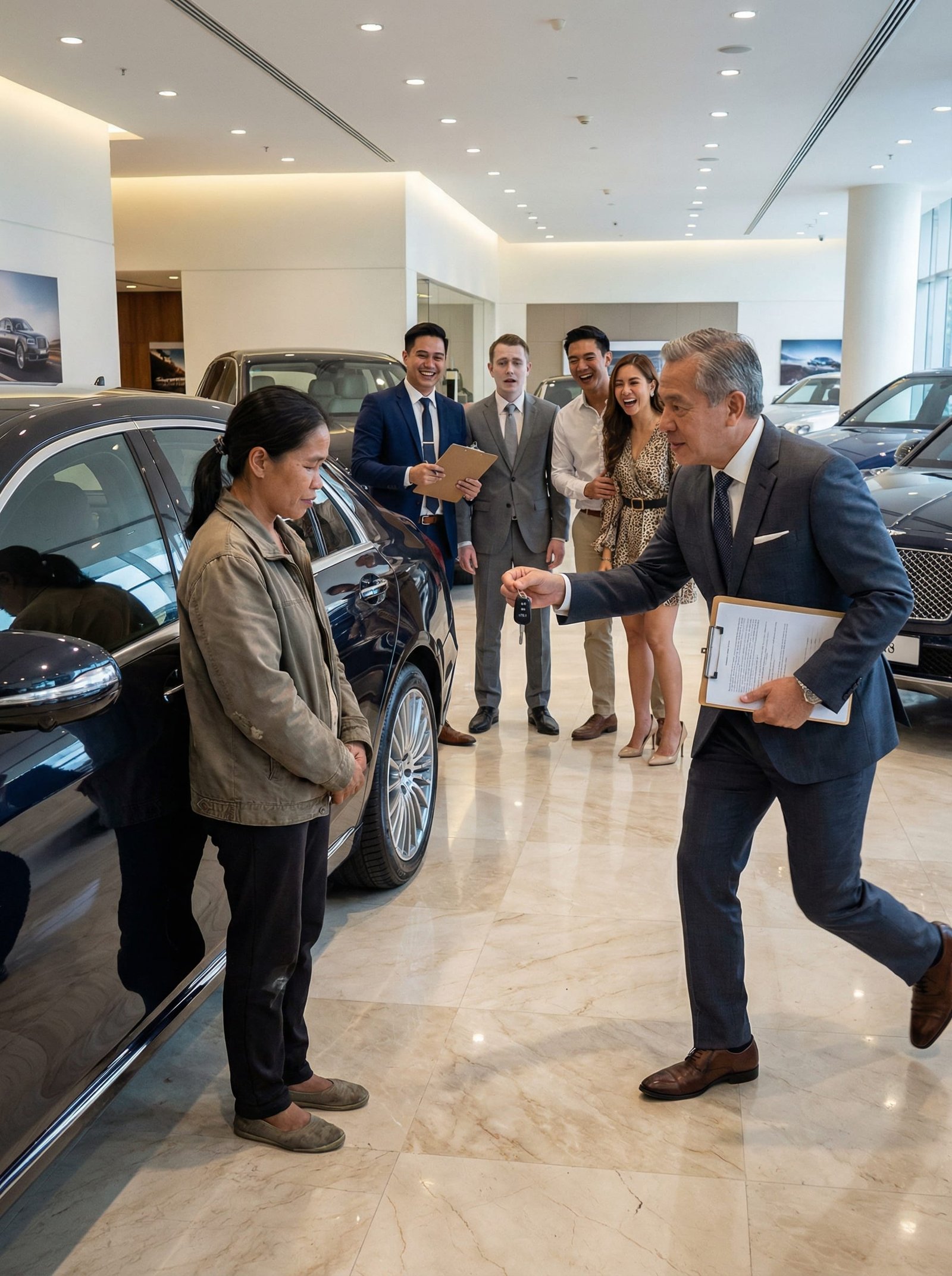 May hawak siyang plastik na supot at isang lumang coin purse. Wala siyang make-up, walang alahas, at walang kahit anong magpapakitang may pera siya. Tahimik lamang siyang tumingin sa isang maitim na sasakyan sa gitna ng showroom, parang may matagal nang iniisip.