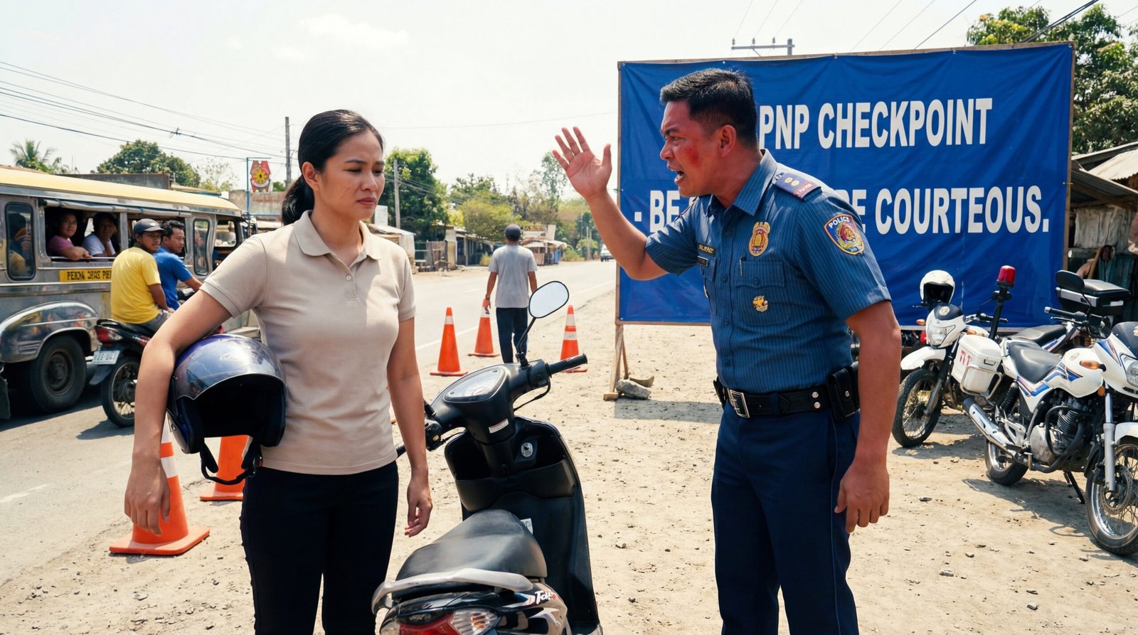 Tanghaling tapat sa highway, alikabok ang hangin at tirik ang araw. Sa gilid ng kalsada, nakatayo ang malaking tarpaulin: “PNP CHECKPOINT – BE RESPONSIBLE, BE COURTEOUS.” Pero sa mismong harap nito, kabaligtaran ang eksena.