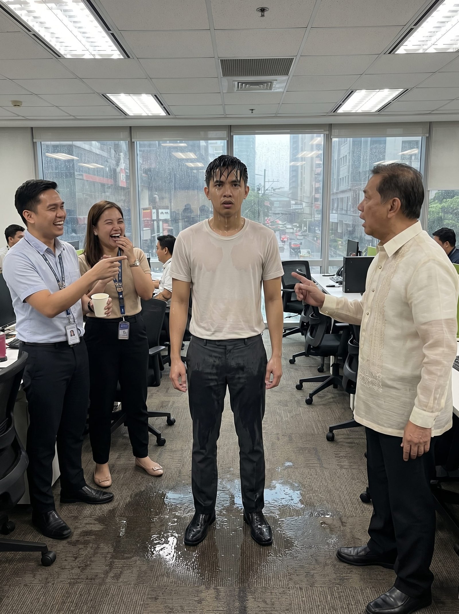 Tumulo ang tubig mula sa buhok ni Rafael pababa sa kanyang mukha, leeg, at damit. Nabasa pati ang ilang papeles sa mesa at nagkaroon ng maliit na puddle sa carpet. Sa paligid, may mga empleyadong napaatras sa gulat, pero may ilan ding hindi napigilan ang mahinang pagtawa.