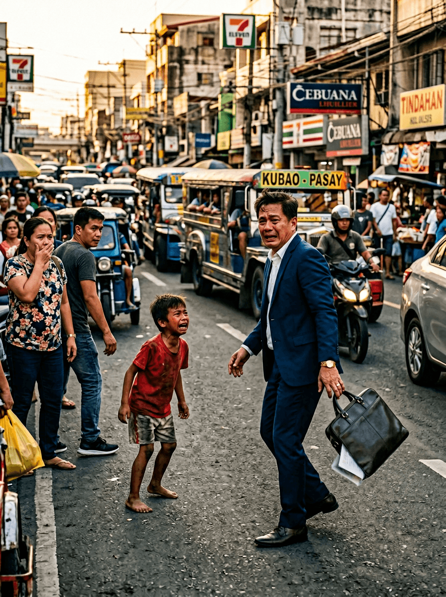 Ngunit bago siya tuluyang makatawid, may isang batang lalaki ang biglang humarang sa kanya. Payat, marumi, walang tsinelas, at halos mapunit na ang pulang damit. Niyakap nito ang hangin sa pagitan nila, saka sumigaw nang buong lakas, “TAY!”