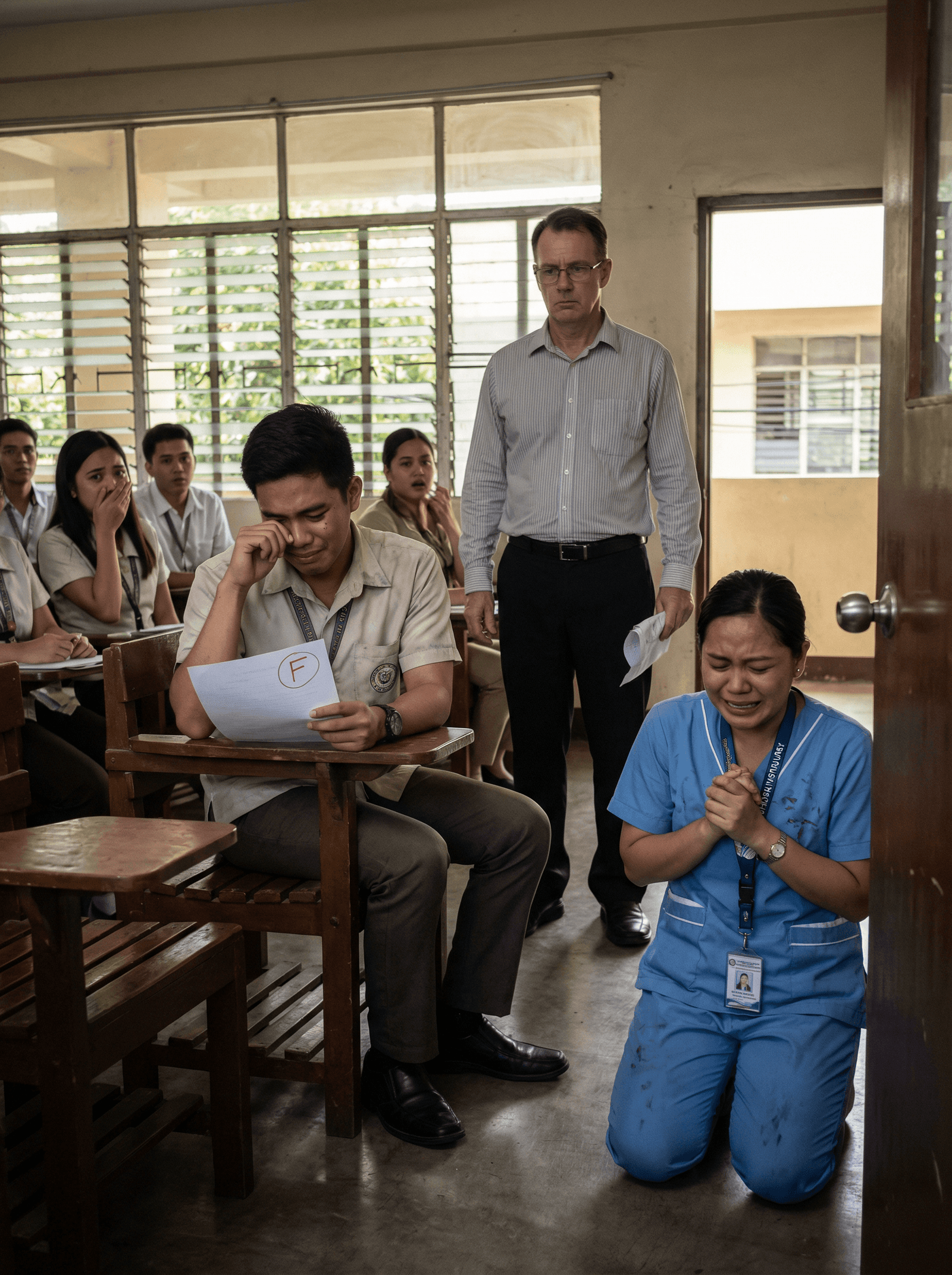 Halos hindi makapagsalita ang babaeng nakasuot ng scrub suit sa tindi ng paghahabol ng hininga. Namumula ang mga mata niya, halatang galing sa iyak at pagmamadali. Hawak niya ang isang puting sobre at isang punit-punit na hospital log sheet. Lumingon siya sa klase, pagkatapos ay tumigil ang tingin kay Miguel na hawak pa rin ang papel na may F.