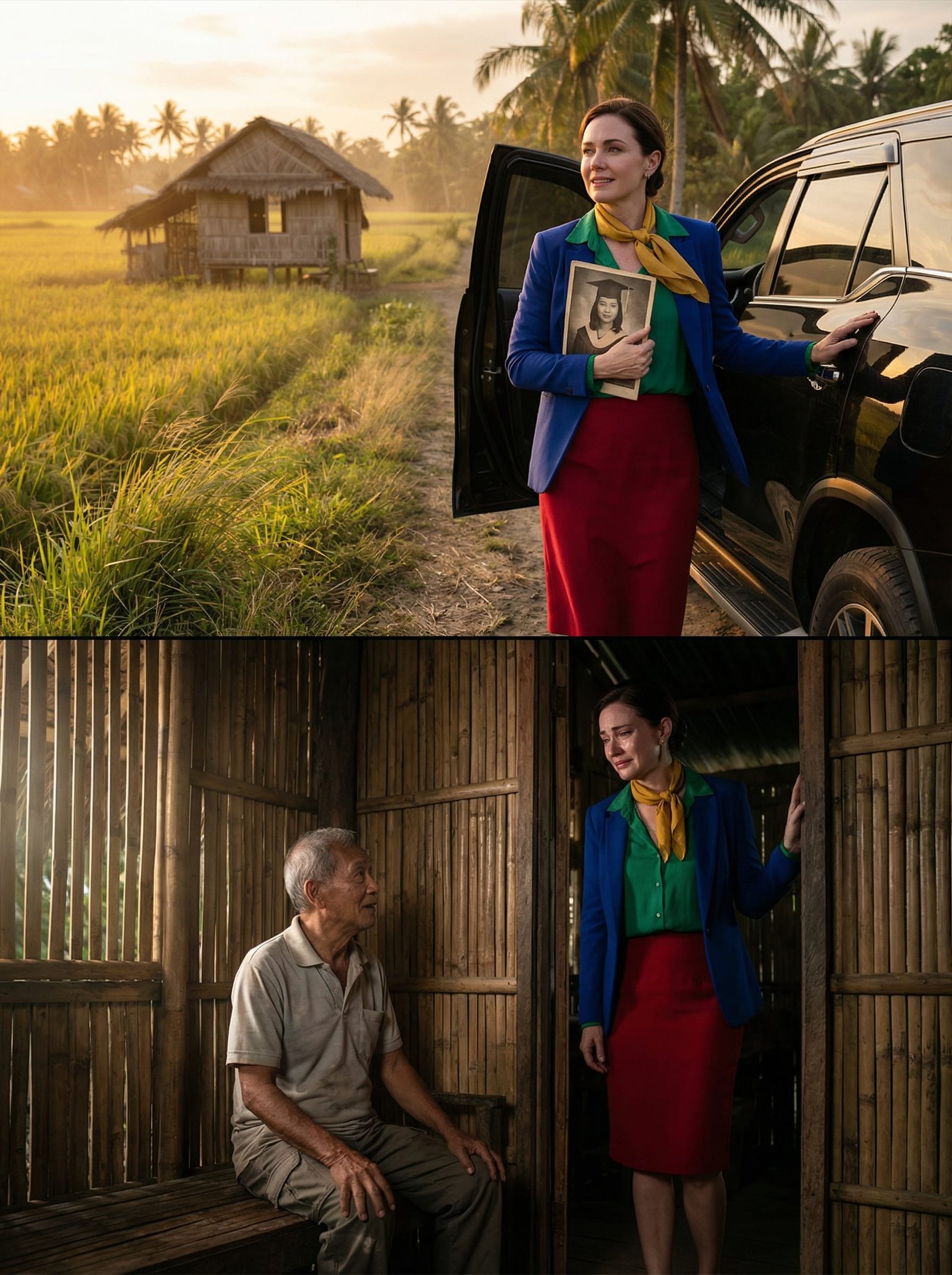Bumaba si Emily Carter mula sa itim na SUV habang lumulubog ang araw sa palayan. Malinis ang hangin, amoy dayami, at ang liwanag ay parang ginto sa dulo ng araw—pero sa dibdib niya, may bigat na hindi kayang tabunan ng ganda ng tanawin. Mahigpit ang hawak niya sa isang lumang larawan: siya, batang payat, naka-graduation toga, at katabi ang lalaking may puting buhok at malapad na ngiti—si Mang Ismael.