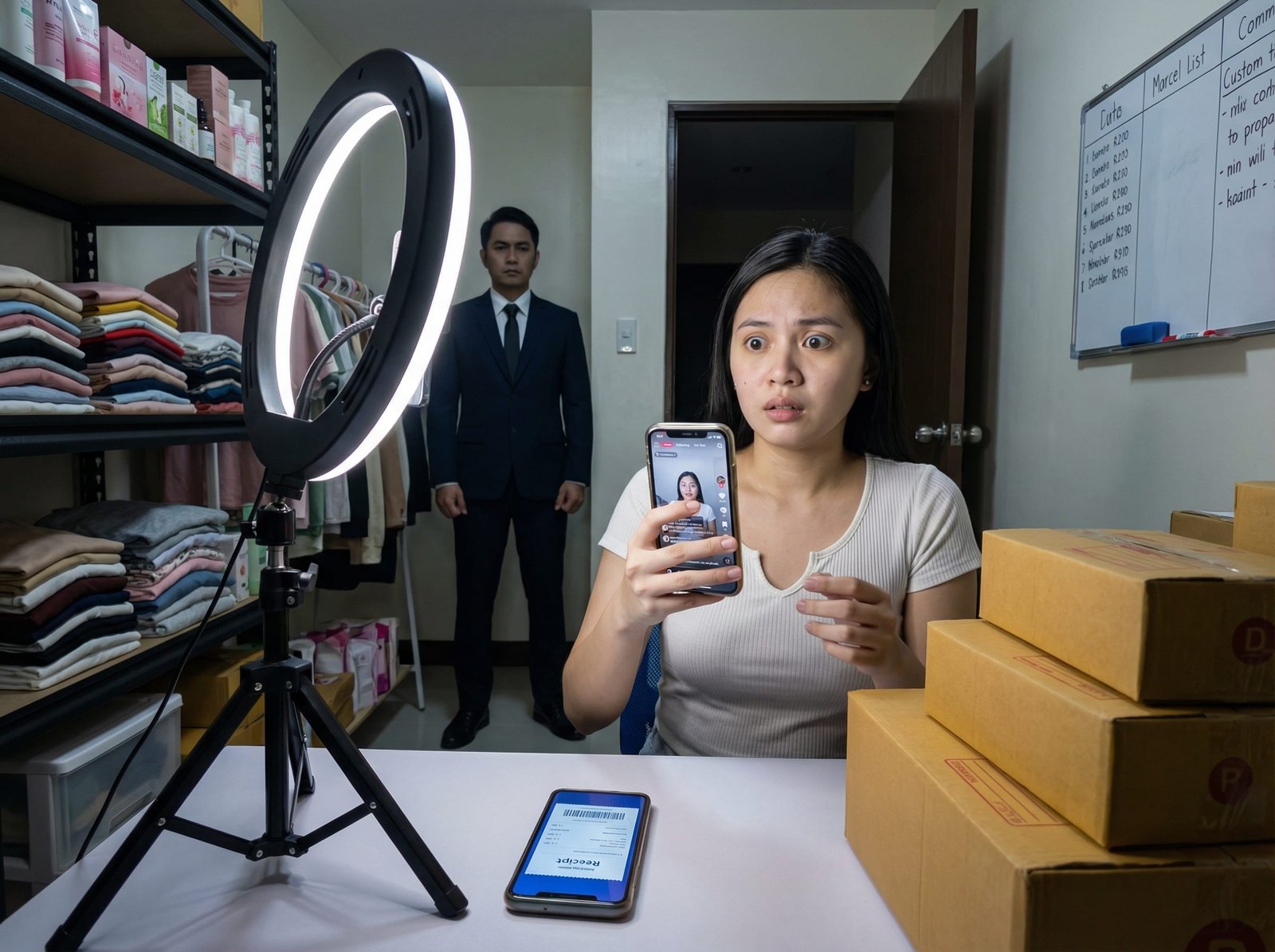 Sa maliit na stockroom na punong-puno ng boxes at nakasalansan na damit, naka-on ang ring light. Naka-face cam si Rica, isang sikat na live seller sa Facebook. Sa likod niya, may whiteboard ng “Parcel List” at mga presyo. Sanay siya sa papuri, sa “Mine,” at sa mga viewers na parang laging nakikiusap.
