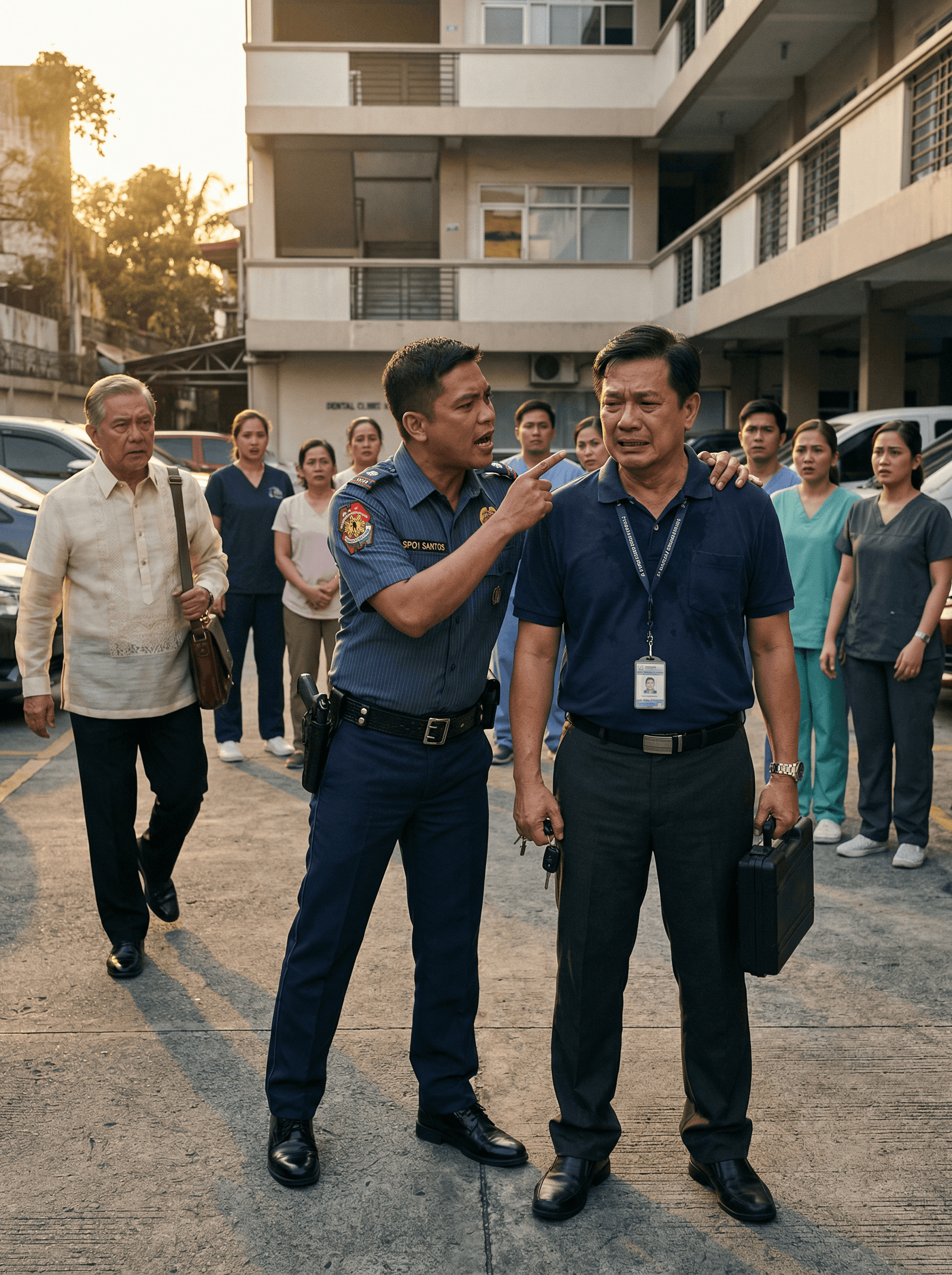 Bago tuluyang umakyat si Dr. Emil sa clinic, huminto siya sa gitna ng parking lot at humarap kay SPO1 Santos. Tahimik pa rin ang paligid. Maging ang mga nurse, utility staff, at mga kasamang pulis ay nakatingin lang, naghihintay kung ano ang sasabihin ng dentista.