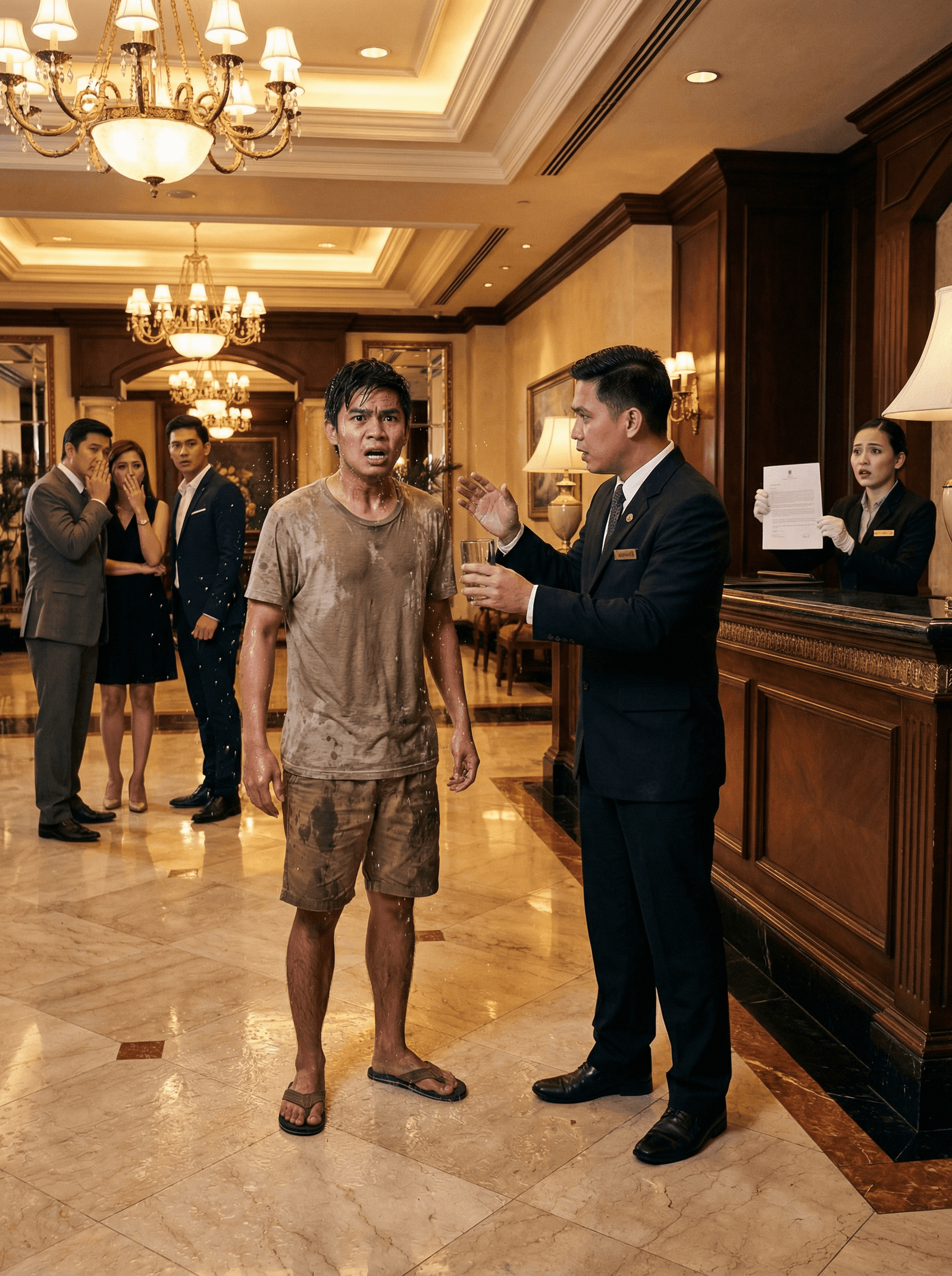 Habang papalapit ang dalawang guwardiya, hindi gumalaw ang binata. Nakatayo lang siya sa gitna ng lobby, tulo pa rin ang tubig mula sa kanyang buhok at manggas. Sa paligid, naroon ang mga matang mapanghusga, mga pabulong na komento, at mga ngiting may halong pangmamaliit.