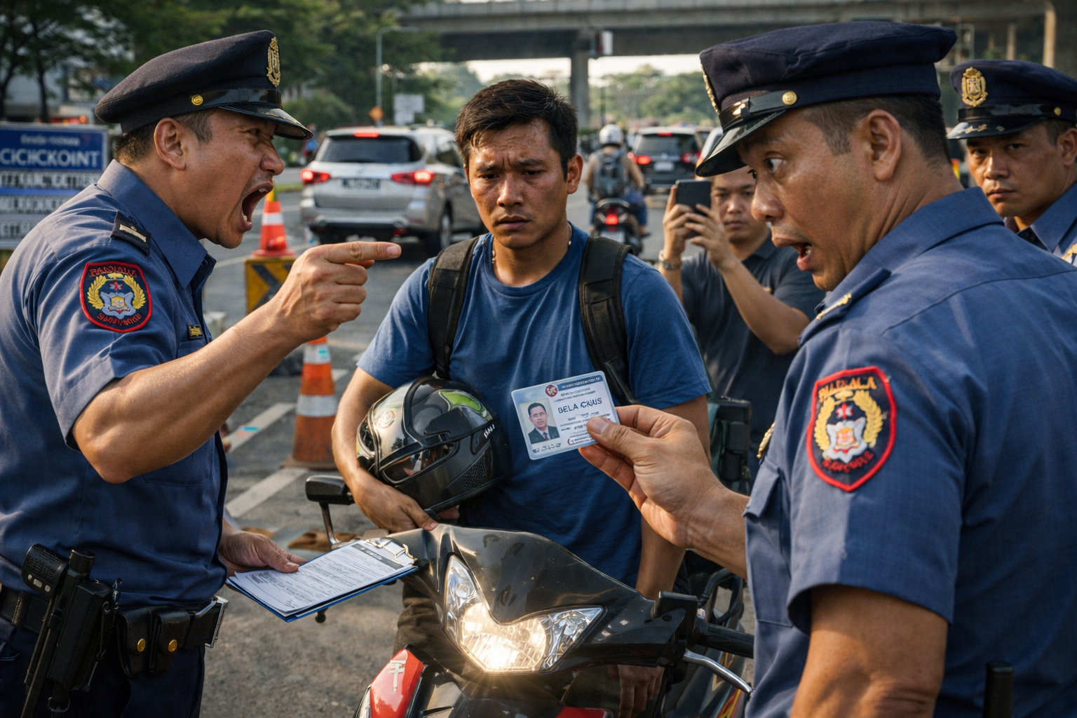 Imbes na sagutin nang maayos, itinuro siya ng pulis na parang may kasalanan na agad. “Bakit ka kinakabahan? May tinatago ka? Baka kung ano yang nasa bag mo.” Tapos lumapit pa ang isa pang pulis, hawak ang clipboard, parang may bitbit na tiket na handa nang ipatong sa buhay ng kahit sinong madaanan nila.