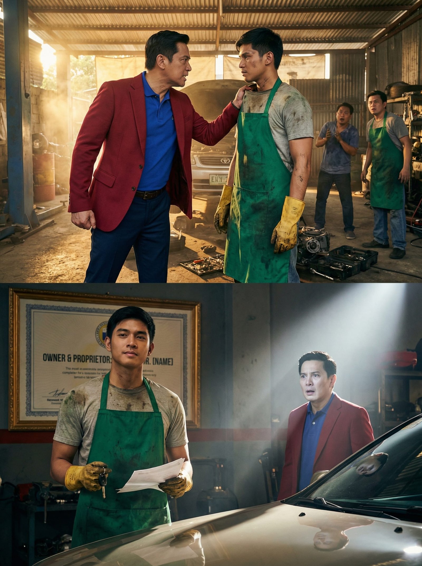 Isang itim na SUV ang huminto sa harap ng talyer. Bumaba ang lalaki—naka-blazer na pula, may relo na parang kayang bumili ng buong kalsada. Kasunod ang driver at dalawang tauhan. Tumigil ang lahat sa pagtrabaho, parang may pumasok na bagyong may pangalan.