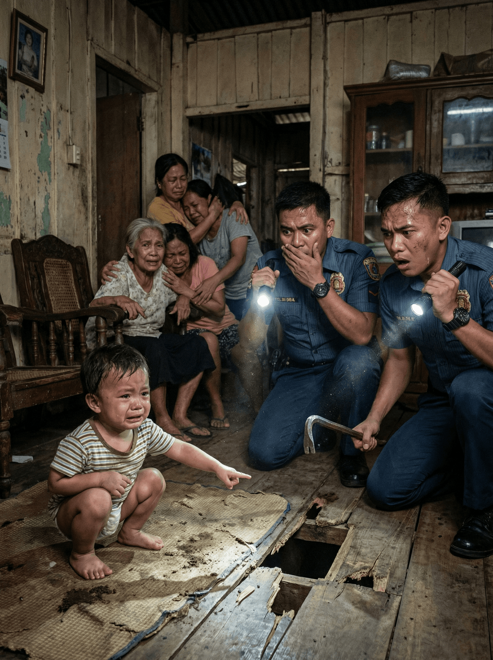 Parang sabay-sabay na tumigil ang paghinga ng lahat nang marinig nila ang mahina ngunit malinaw na tinig mula sa ilalim ng sahig. Hindi na nag-aksaya ng oras ang mga pulis. Mabilis nilang binakbak ang mga tabla gamit ang bareta at martilyo, habang si Toto ay patuloy sa paghikbi at si Aling Cely ay halos mapaluhod sa sobrang kaba.