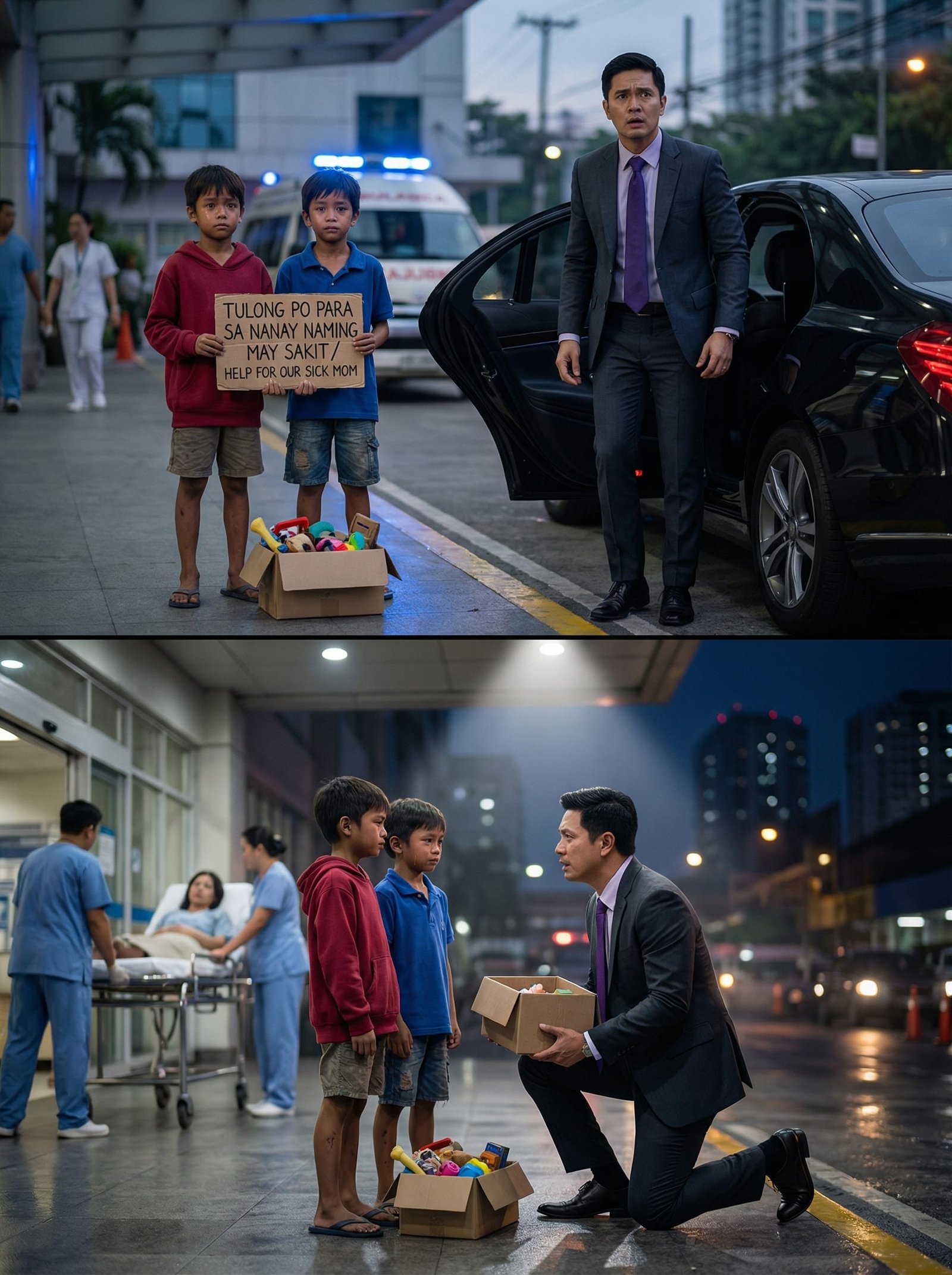 Maliwanag ang ilaw sa tapat ng ospital, pero malamig ang hangin—lalo na sa mga taong walang kasiguraduhan. Sa sidewalk, sa tabi ng drop-off lane, nakatayo ang dalawang batang magkamukha: sina Jomar at Jamil, kambal na walong taong gulang. Parehong payat, parehong may bilog na mata, parehong pilit nagiging matapang kahit nanginginig na ang tuhod.