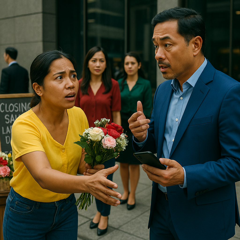 Sa gitna ng Makati, sa harap ng mataas na gusali na salamin ang pader at marmol ang sahig, nagsimula ang umaga ni Alejandro “Alex” Villareal sa pare-pareho niyang ritwal: naka-asul na mamahaling suit, hawak ang kape sa isang kamay at cellphone sa kabila, paulit-ulit na tine-check ang email na may subject na “FINAL OFFER – MIDDLE EAST INVESTORS”. CEO siya ng isang mabilis na lumalaking tech company na kilala sa buong Southeast Asia. Sa araw na iyon, magdedesisyon ang grupo ng mga Arabong investor kung papasok sila sa multi-milyong dolyar na partnership o lilipat sa kakompetensiya. Para kay Alex, ito ang meeting na magdidikta kung magiging “regional giant” ang kumpanya niya o mananatili lang lokal. Habang naglalakad siya palabas ng building para sunduin sa lobby ang mga investor, napahinto siya nang may biglang humarang sa daraanan niya—isang babaeng may hawak na maliit na bouquet ng rosas at daisies, naka-dilaw na blusa, halatang pagod pero pilit na nakangiti. “Sir, bili na po ng bulaklak,” sabi ng babae, medyo nanginginig ang boses, halatang ilang beses nang tinanggihan kanina. “Closing sale na po kami… baka po puwedeng—” Napakunot ang noo ni Alex, hindi sa galit, kundi sa inis na naputol ang konsentrasyon niya.
