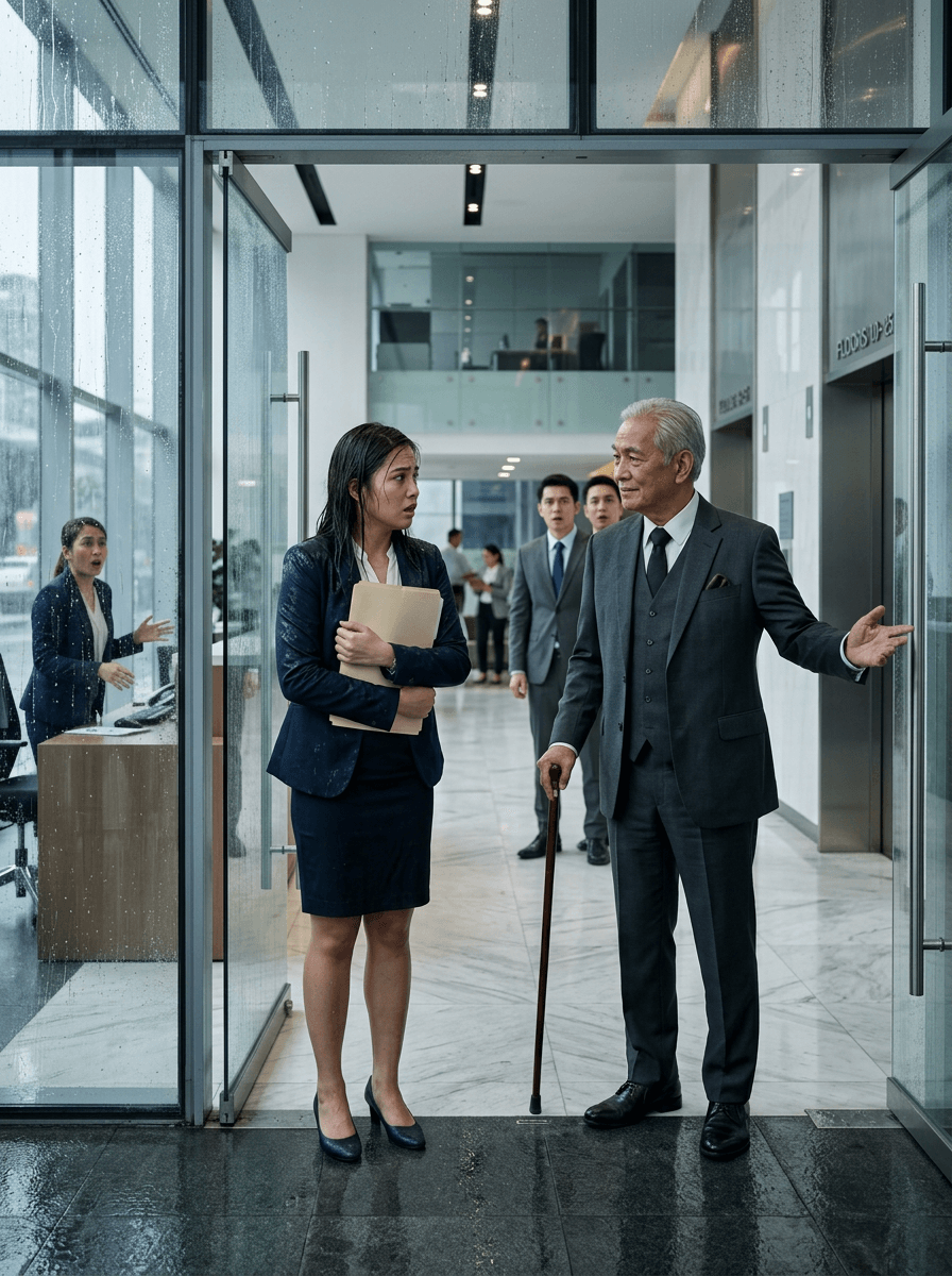 Paglapit niya sa revolving door, may nakita siyang matandang lalaki sa gilid—basang-basa, hawak ang baston, hirap na hirap sumilong. Naka-simple lang na coat, nangingitim ang sapatos sa putik, at nanginginig ang kamay na parang malamig na malamig.