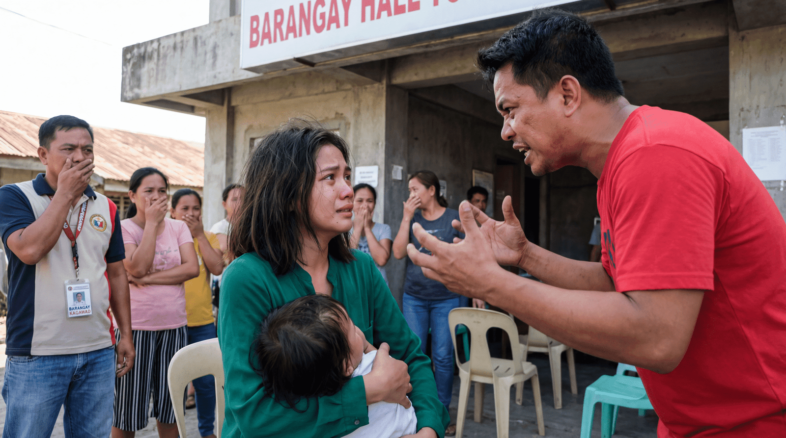 Sa loob ng barangay hall, pinagharap sila. Si Lia, nakaupo, hawak ang sanggol na ngayon ay umiiyak na. Si Marcos, nakasandal sa pader, nakataas ang baba, parang walang kasalanan.