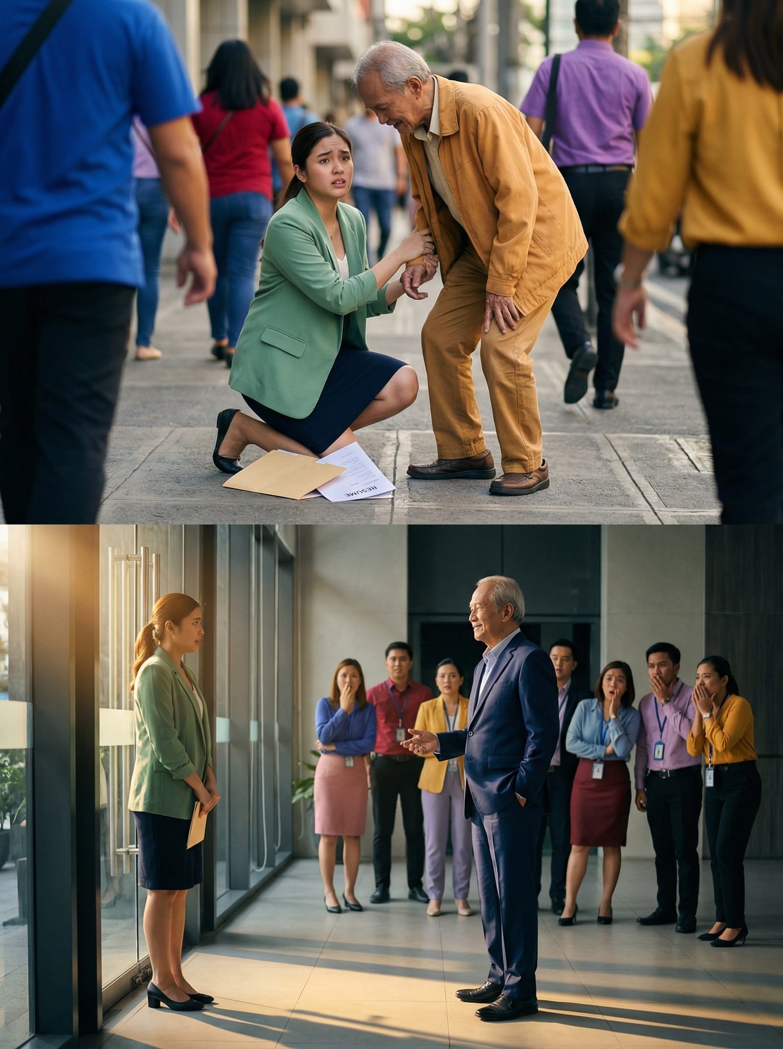 Pero ilang kanto pa lang mula sa building, may narinig siyang mahinang ungol. Sa gilid ng daan, may matandang lalaki na halos mapaupo, hawak ang tuhod, at nanginginig ang kamay. Nahulog sa lupa ang mga papel at envelope na dala nito. Dumaraan ang mga tao—may tumitingin, pero tuloy-tuloy lang, parang walang nakikita.