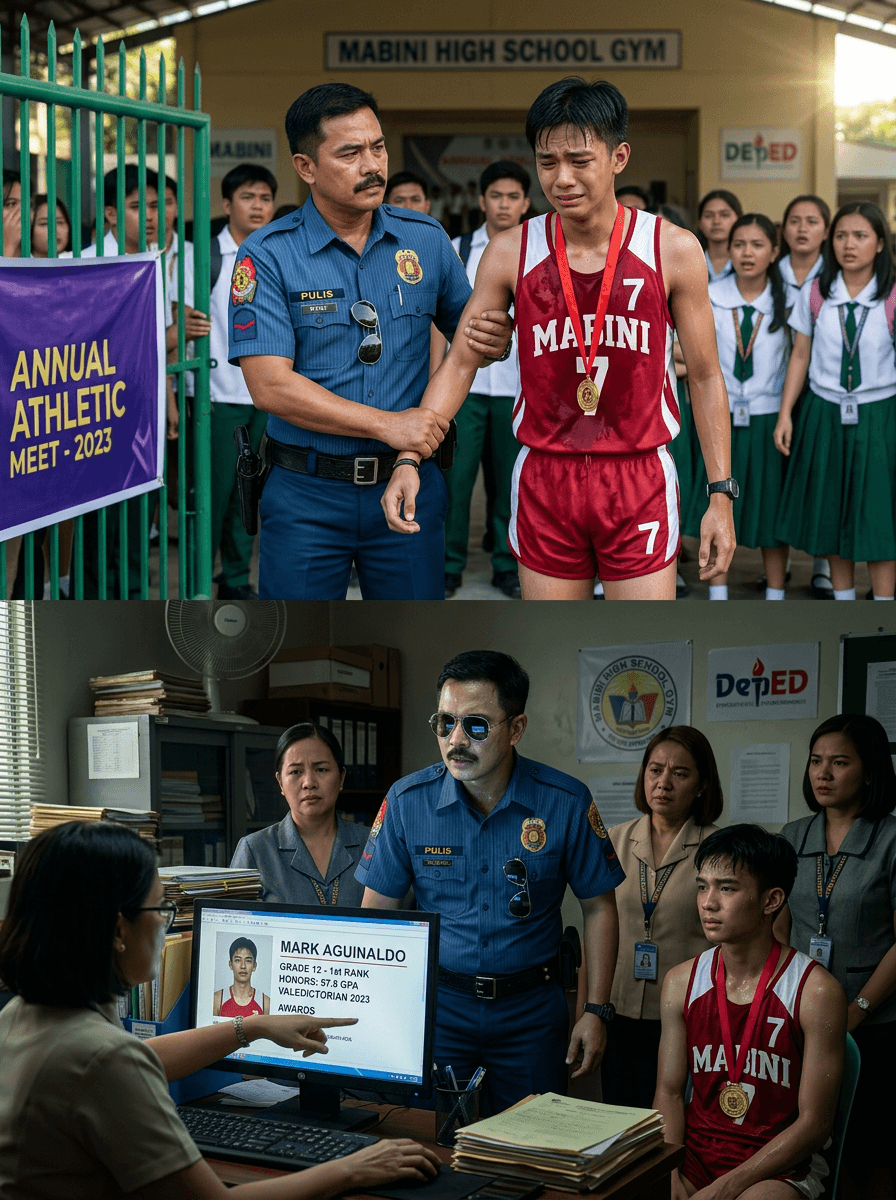 Nag-iingay ang Mabini High School Gym. Naka-banner pa ang “ANNUAL ATHLETIC MEET,” at ang mga estudyante, nagtatalunan sa tuwa. Sa gitna ng crowd, tumayo si Mark Aguinaldo—Grade 12, suot ang pulang jersey na may number 7, nakasabit sa leeg ang gold medal. Pawis na pawis, nanginginig sa pagod, pero nakangiti—yung ngiting alam mong pinaghirapan.