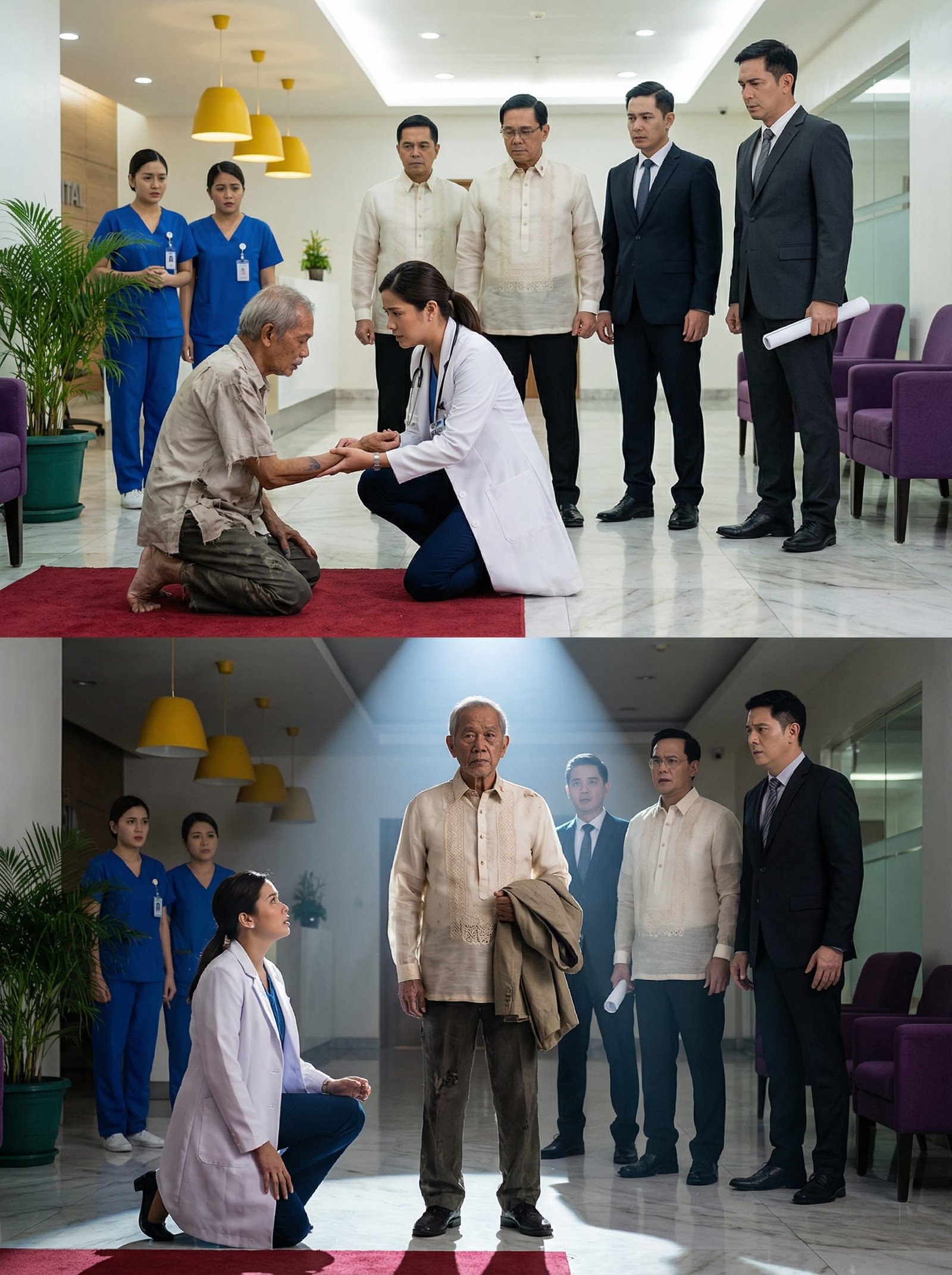 Sa lobby ng isang kilalang private hospital, kumikinang ang marmol at tahimik ang aircon—parang bawal ang ingay ng gutom at hirap. Pero noong araw na iyon, nabasag ang kaayusan nang may matandang pulubi na pumasok, nanginginig ang tuhod at halos gumagapang sa sahig. Marumi ang damit, kupas ang pantalon, at sugatan ang braso.
