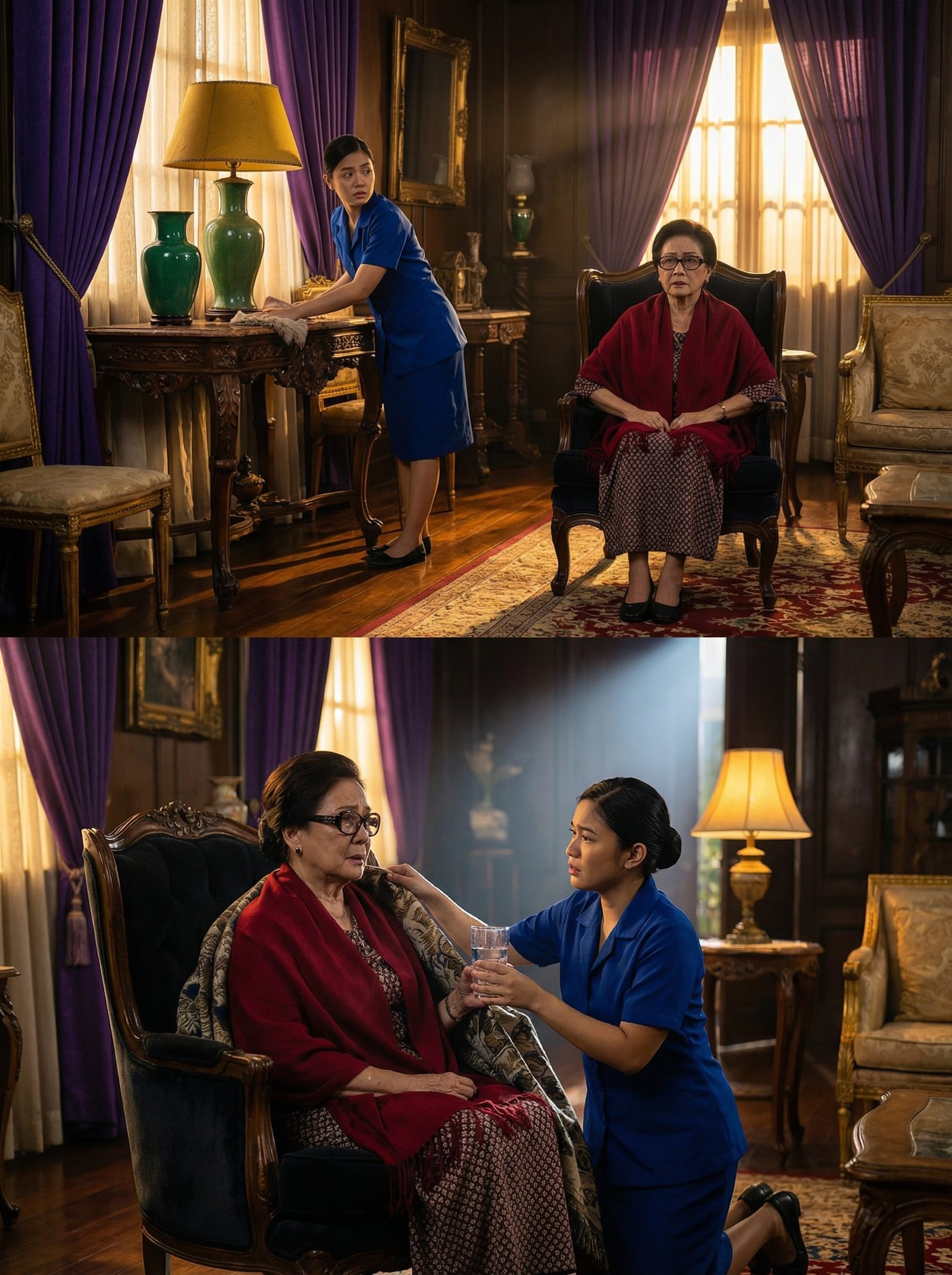 Sa tabi ng mesa, abala ang bagong kasambahay na si Lena—nakasuot ng asul na uniporme, maingat magpunas ng alikabok, tahimik ang galaw. Halos tatlong buwan pa lang siya sa bahay, pero siya na ang palaging nag-aabot ng tubig, nag-aayos ng gamot, at nagbabantay kay Doña Isadora tuwing gabi.