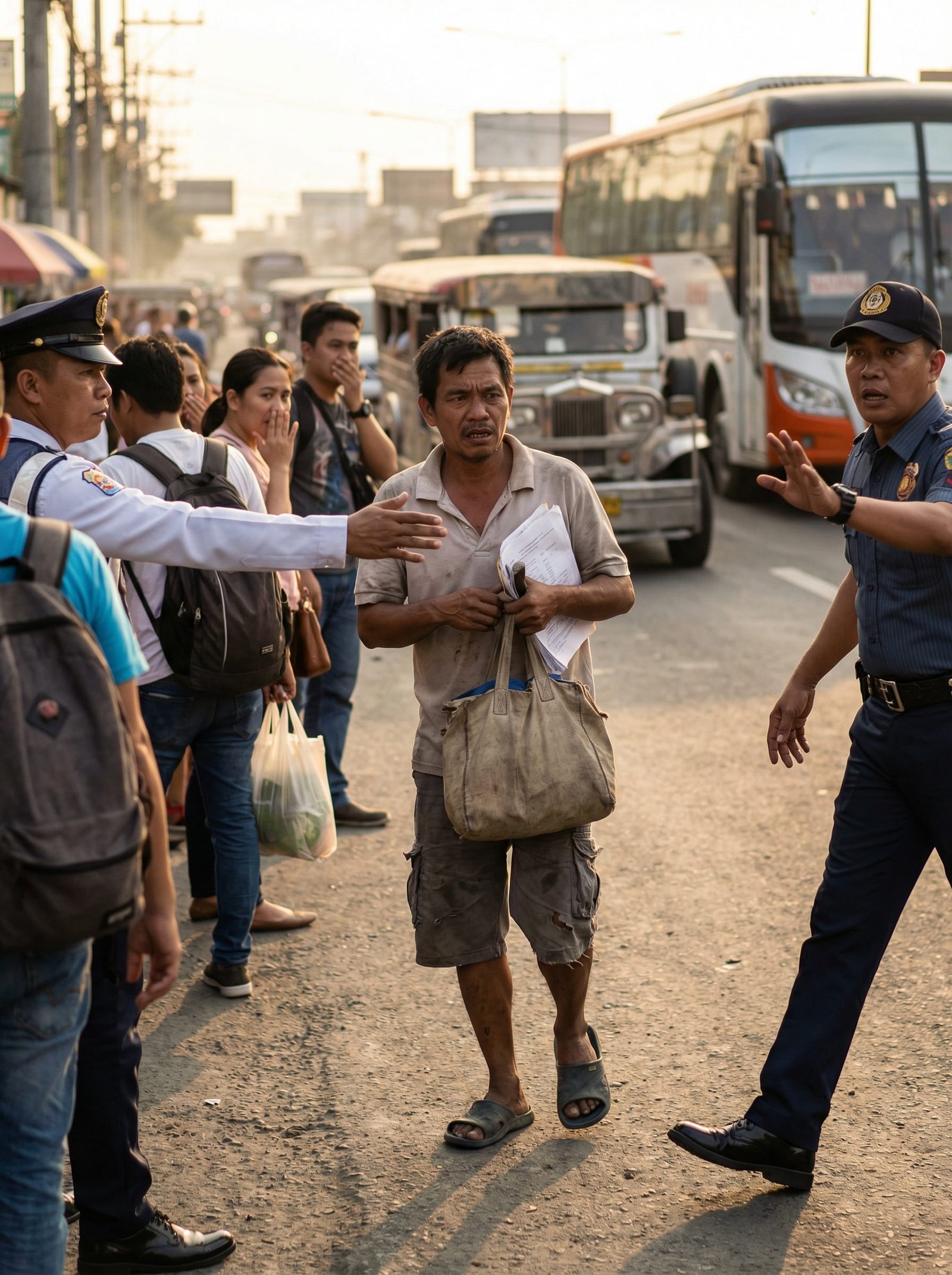 Patuloy ang daloy ng mga sasakyan sa likod nila, ngunit tila huminto ang oras sa mismong bus stop. Nasa gitna si Mang Lito, namumutla at nanginginig, habang si Officer Brando ay nakatayo sa harap niya na parang bantay na handang itulak siya palayo anumang oras.