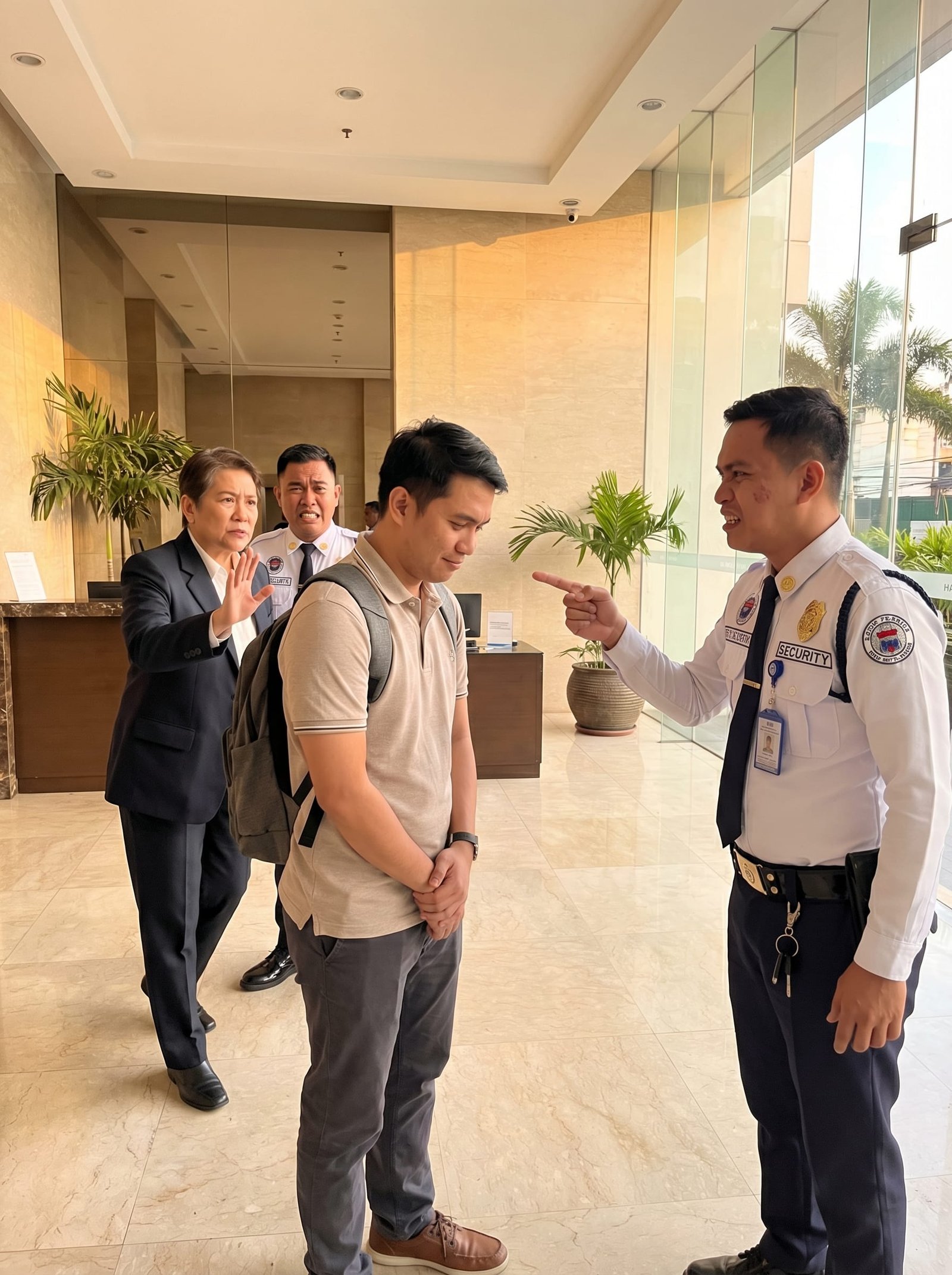 Bago pa makasagot ang receptionist, sumingit na ang bastos na guwardiyang si Guard Tino. Matikas ito, malakas ang boses, at halatang sanay mang-intimidate ng mga ordinaryong bisita.