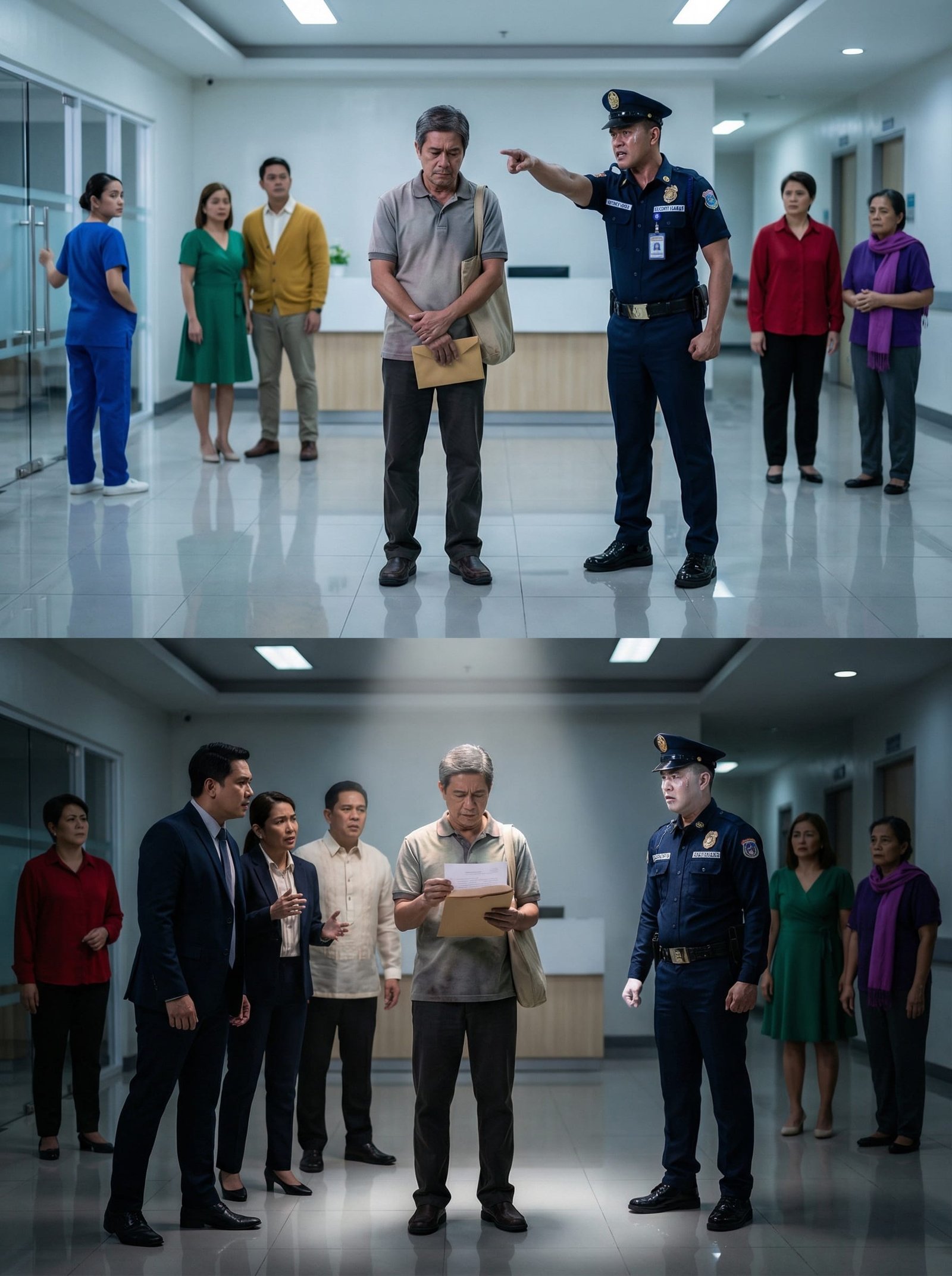 Maliwanag ang hospital lobby—malinis ang sahig, malamig ang aircon, at abala ang mga tao: may nagmamadaling nurse, may umiiyak na magulang, may pasyenteng nakaupo sa wheelchair. Sa gitna ng lahat, pumasok ang isang lalaking may edad, simpleng polo shirt, kupas na pantalon, at lumang shoulder bag. Hawak niya ang isang brown envelope na parang napakahalaga.