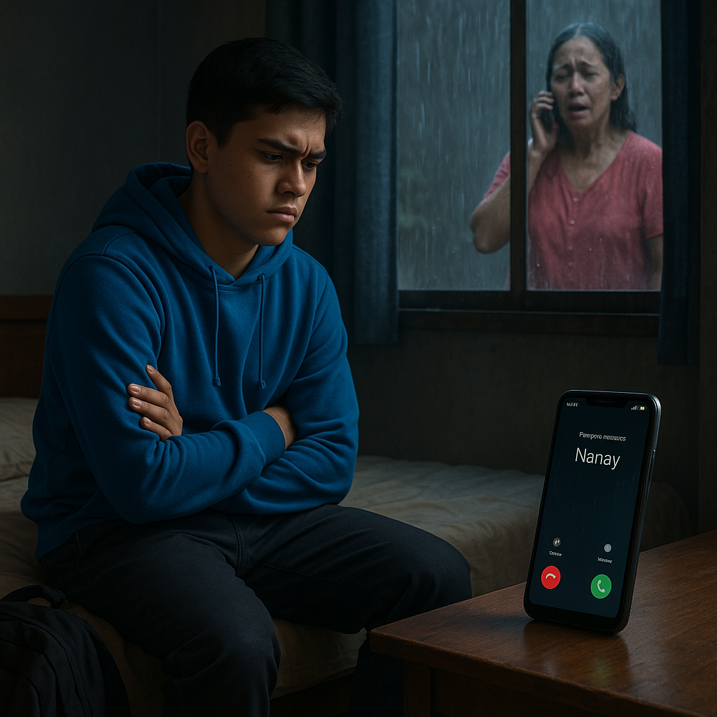 Ako si Paolo, first year sa kolehiyo. Sa boarding house, ang mundo ko ay headphones, hoodie, at pader na kulay-abo. Sa labas, tuloy ang bagyo; sa loob, tuloy ang tampo. At sa mesa, nakaharap sa akin ang cellphone—umiilaw, nanginginig, at may salitang ayaw kong harapin: “Nanay.”