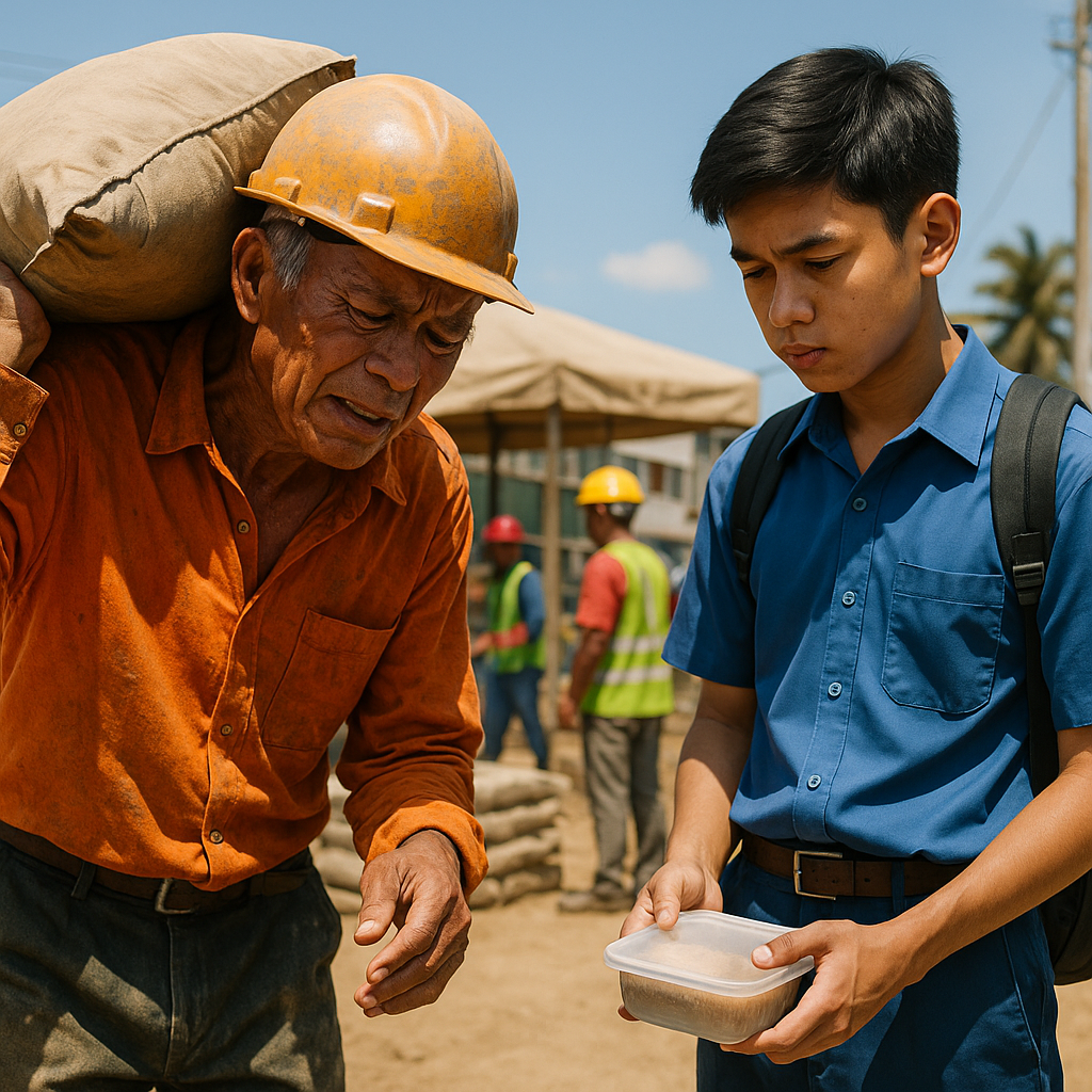 Naglakad ako palayo, umiwas muna. Sa lilim ng kubol, binaligtad ko ang baunan ko—adobong sayote at konting baboy, pinaghati-hati ni Nanay. Pinagtiyagaan ko ng ilang subo. Mula sa gilid ng mata ko, tanaw si Tatay. Hinaplos niya ang tagiliran, huminga nang malalim, tumayo, sinuot ulit ang helmet, at bumalik sa trabaho. Parang kulang ang lilim para sa init ng konsensiya ko.