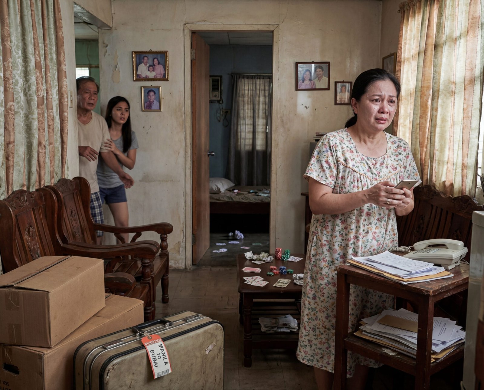 Bumalik si Mila sa sala, umupo sa upuang kahoy. Tinitigan niya ang maleta—tag na “DUBAI” nakasabit. Lahat ng paghahanda niya para sa abroad, biglang bumigat. Ang perang pinuhunan niya, perang galing sa luha at pagod, nasa loob ng isang sugal na hindi niya kontrolado.
