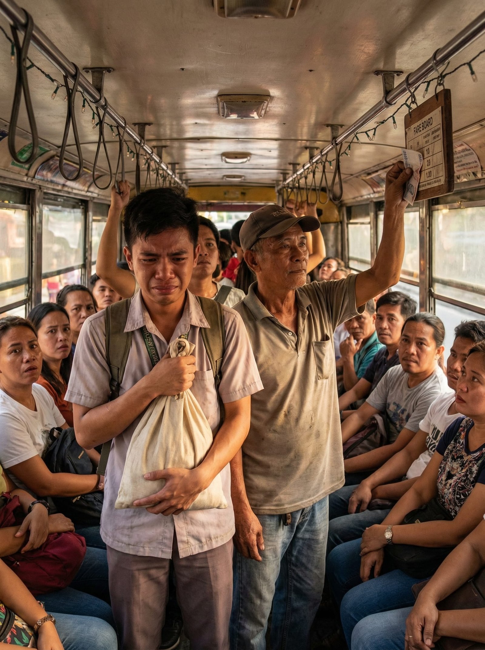 At doon, sa gitna ng siksikan, may batang estudyante na sumakay—halatang kabado, walang pamasahe, nanginginig.
