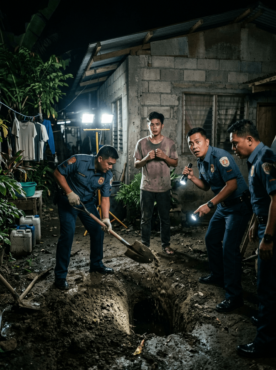 Sa gilid, si PO1 Salazar ang unang napatingin sa lupa. Totoo ngang kakaiba ang bahagi ng bakuran. Sa gitna ng putik, may pahabang parte na mas malambot kaysa paligid, parang bagong hukay at tinakpan ulit. May amoy ring kakaiba—halo ng lupa, kalawang, at parang langis.