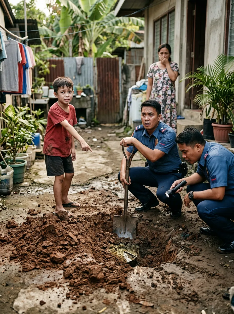 Nagtaka ang mga pulis kung bakit nasa kamay ng bata ang susi ng nawawala niyang ama. Saka dahan-dahang itinuro ni Emil ang likod-bahay—ang bahagi ng lupa na tila bagong hukay at muling tinabunan. “Diyan po,” nanginginig niyang sabi. “May itinago po riyan si Tatay noong gabing umulan. Narinig ko po siyang umiiyak.”