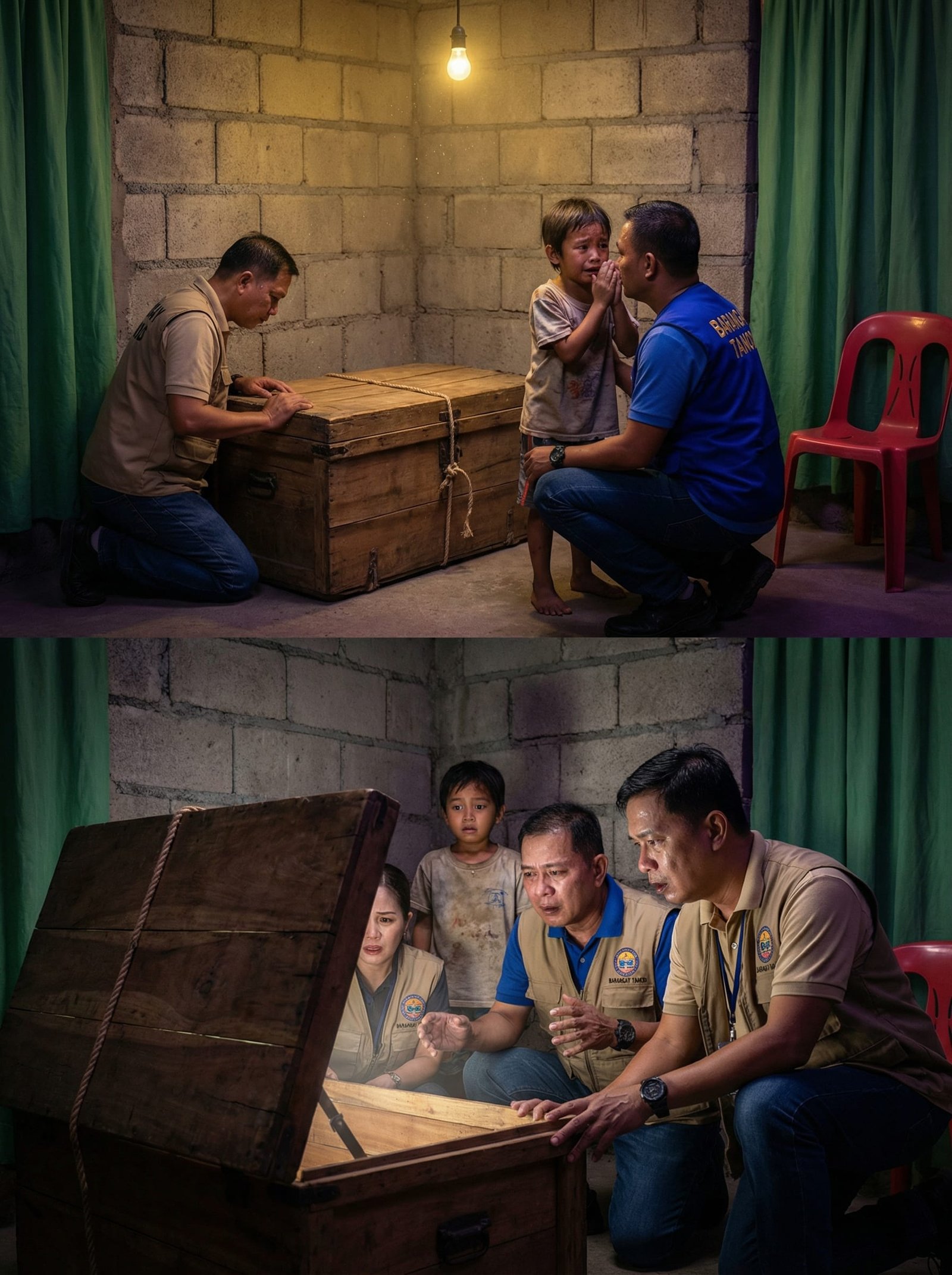 Madilim na ang paligid nang dumating sina Tanod Lito at Kagawad Ramil sa maliit na bahay na gawa sa hollow blocks. Isang bumbilyang nakabitin lang sa kisame ang ilaw—mahina, nanginginig ang anino sa pader. Sa tabi ng kurtinang berdeng manipis, may isang pulang monobloc na walang nakaupo. Sa gitna ng kuwarto, naroon ang lumang baul na may tali at kalawanging kandado.