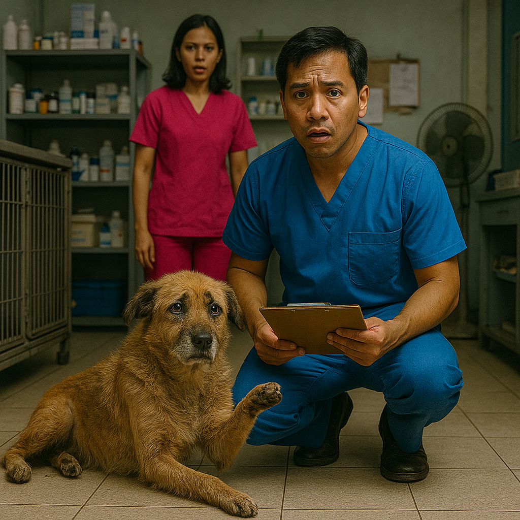 Makulimlim ang hapon sa maliit na klinika—mga estante ng bote at gasa sa dingding, kulob na amoy ng antiseptic, humuhuning electric fan sa tabi ng cork board. Naka-tungkod ang isang aso sa malamig na tiles: gusgusing kayumangging balahibo, mapupungay na mata na parang laging may iniintindi, at bahagyang nakataas ang kanang paa, mistulang humihingi ng pansin. Sa harap niya, nakaluhod si Dr. Marco—asul ang scrub suit, clipboard sa kamay, nanlalaki ang mata sa pagtataka. Sa likuran, pumasok si Liza na naka-rosas na scrub, napahinto, at napasinghap. “Doc… si Tagpi na naman?”