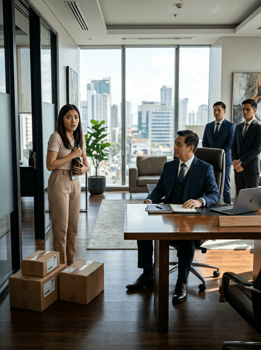Bago pa siya makatanggi, bumukas ang glass door. Isang malawak na opisina, city view, wood floor, at isang executive desk na parang sa pelikula. Sa gilid, may tatlong kahon—parang delivery.