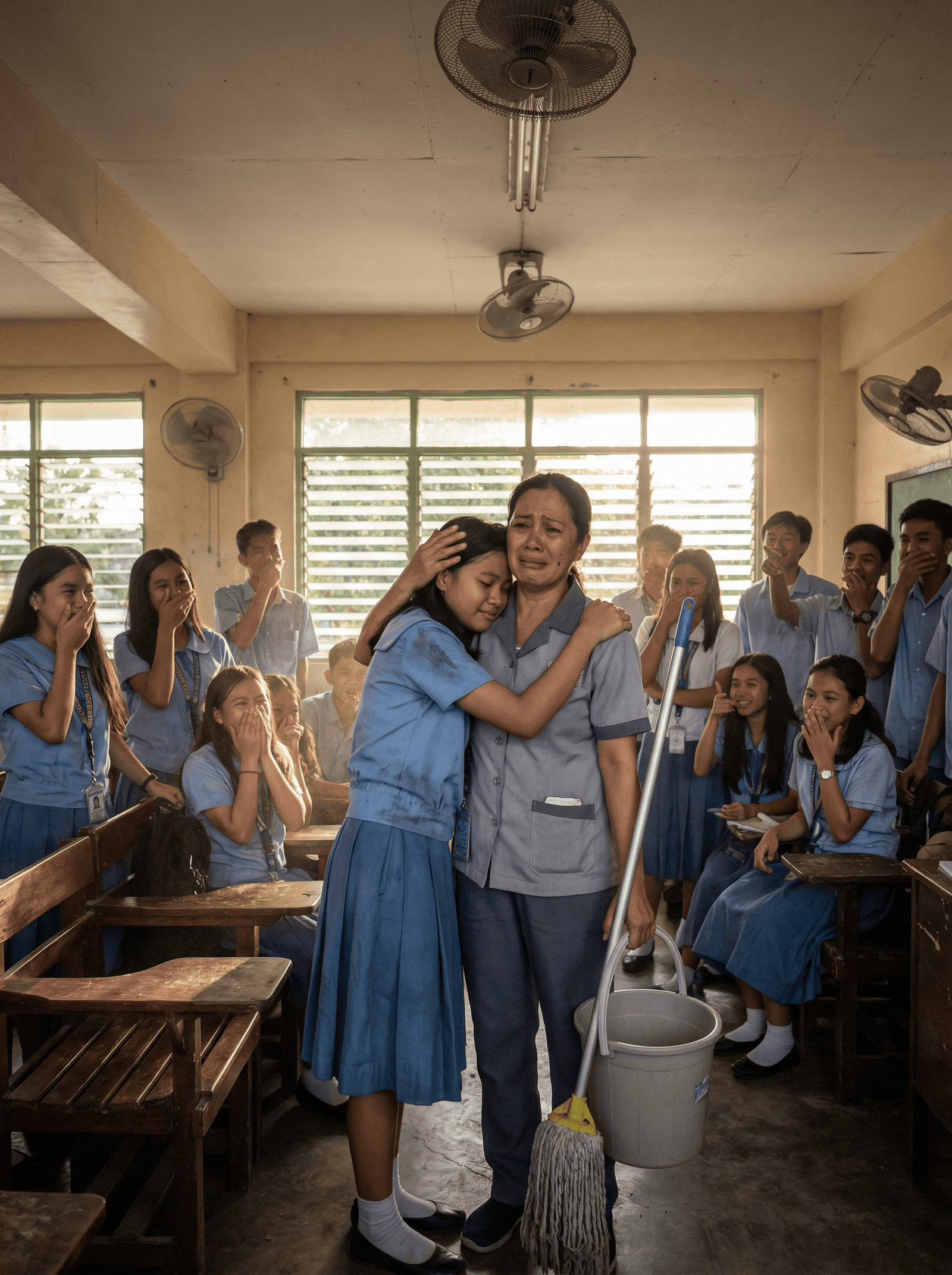 Sa harap ng buong paaralan, mahigpit na niyakap ni Maria ang kanyang ina. Hindi na niya napigilan ang pag-iyak. Ang lahat ng hiya, sakit, at pangungutyang tiniis niya sa mga nakaraang linggo ay tila sabay-sabay na lumabas sa yakap na iyon. Ngunit sa pagkakataong ito, hindi na luha ng kahihiyan ang dumadaloy sa kanyang pisngi—kundi luha ng pagmamalaki.