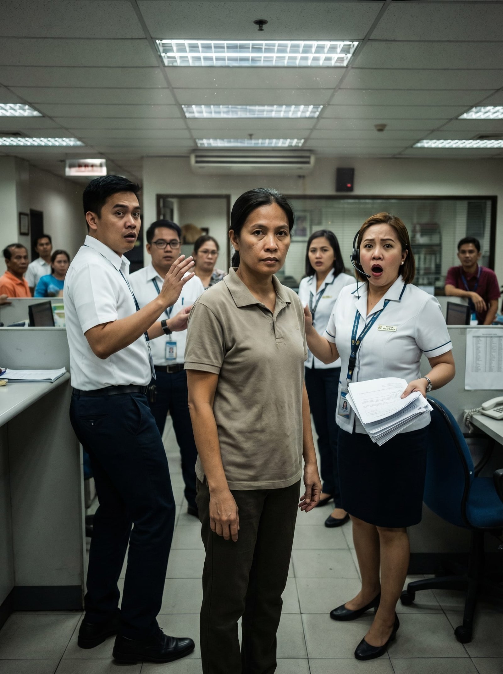 May ilang teller ang napatingin na lang, halatang hindi komportable, pero walang naglakas-loob sumita. Sa likod ng silid, may isang utility staff na si Mercy na tila gustong lumapit, ngunit natigilan din sa takot na baka siya naman ang mapagbuntunan.