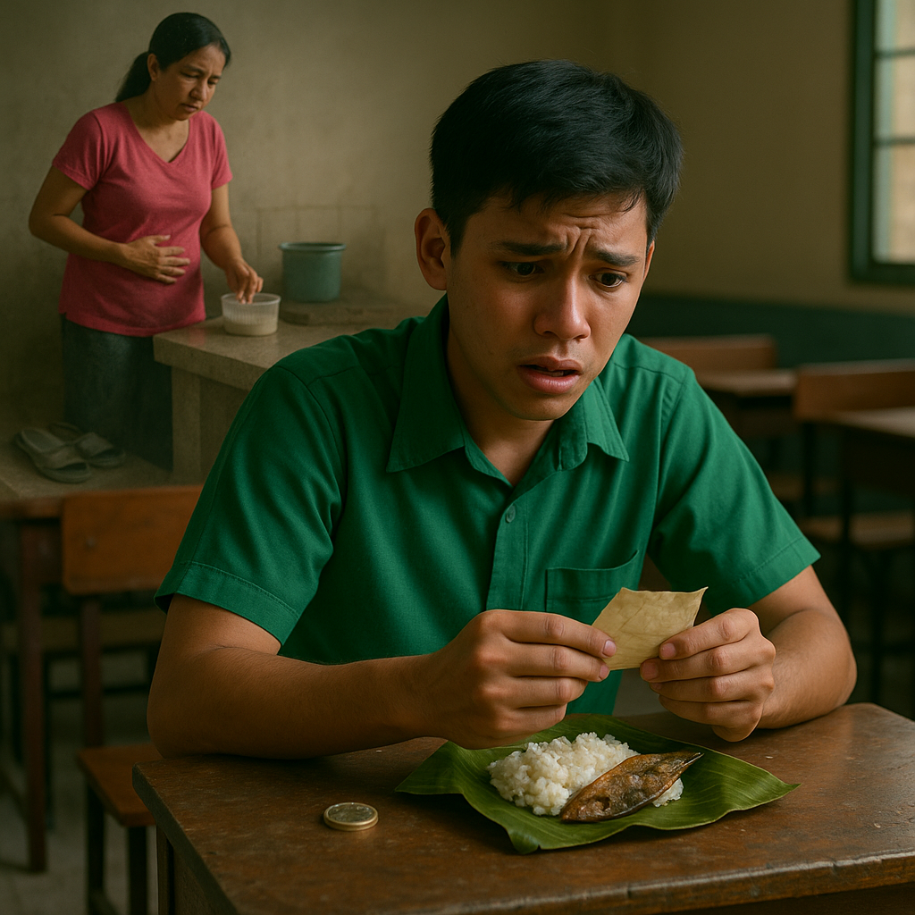 Tinuhog ko ng tingin ang galunggong. Pupunitin ko na sana, nang mapansin ko si Bren sa harap ko—nakatingin sa baon ko pero hindi lumalapit. Siya ’yung madalas humingi sa tindahan ng “utang muna” at madalas din nasisita. Tumikhim ako, pinilas ang kalahati ng kanin, at nilagay sa maliit na dahon. “Bren,” bulong ko, “kalahati sa ’yo. Huwag ka na magpanggap na busog.”