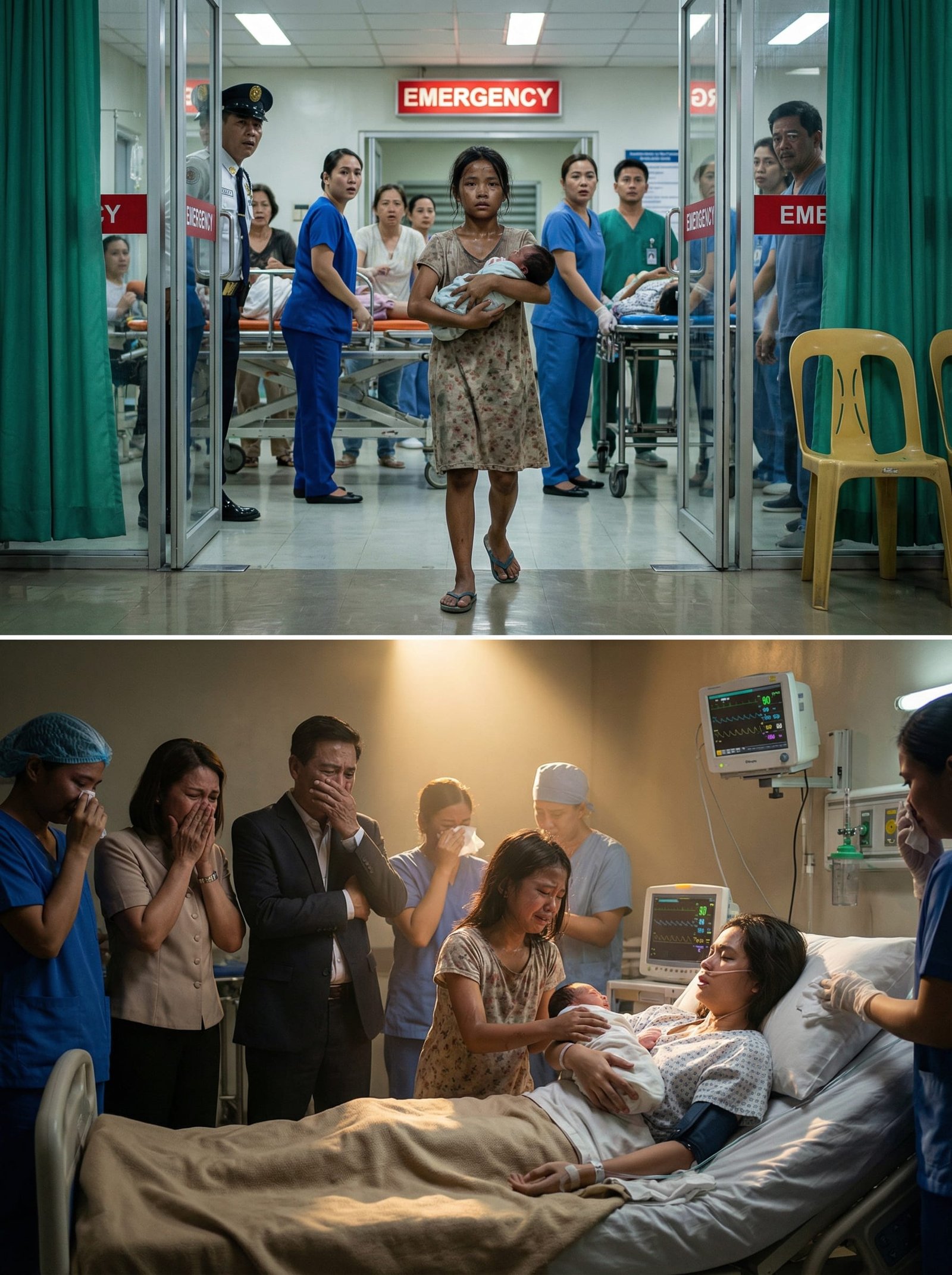 Bumukas ang automatic na salamin sa may EMERGENCY, at biglang nanahimik ang hallway. Sa gitna ng ilaw na maputi at amoy ng gamot, pumasok ang isang batang babae—mga sampung taong gulang lang—nakasuot ng lumang bestida, basang-basa ang laylayan, at nanginginig ang mga tuhod.