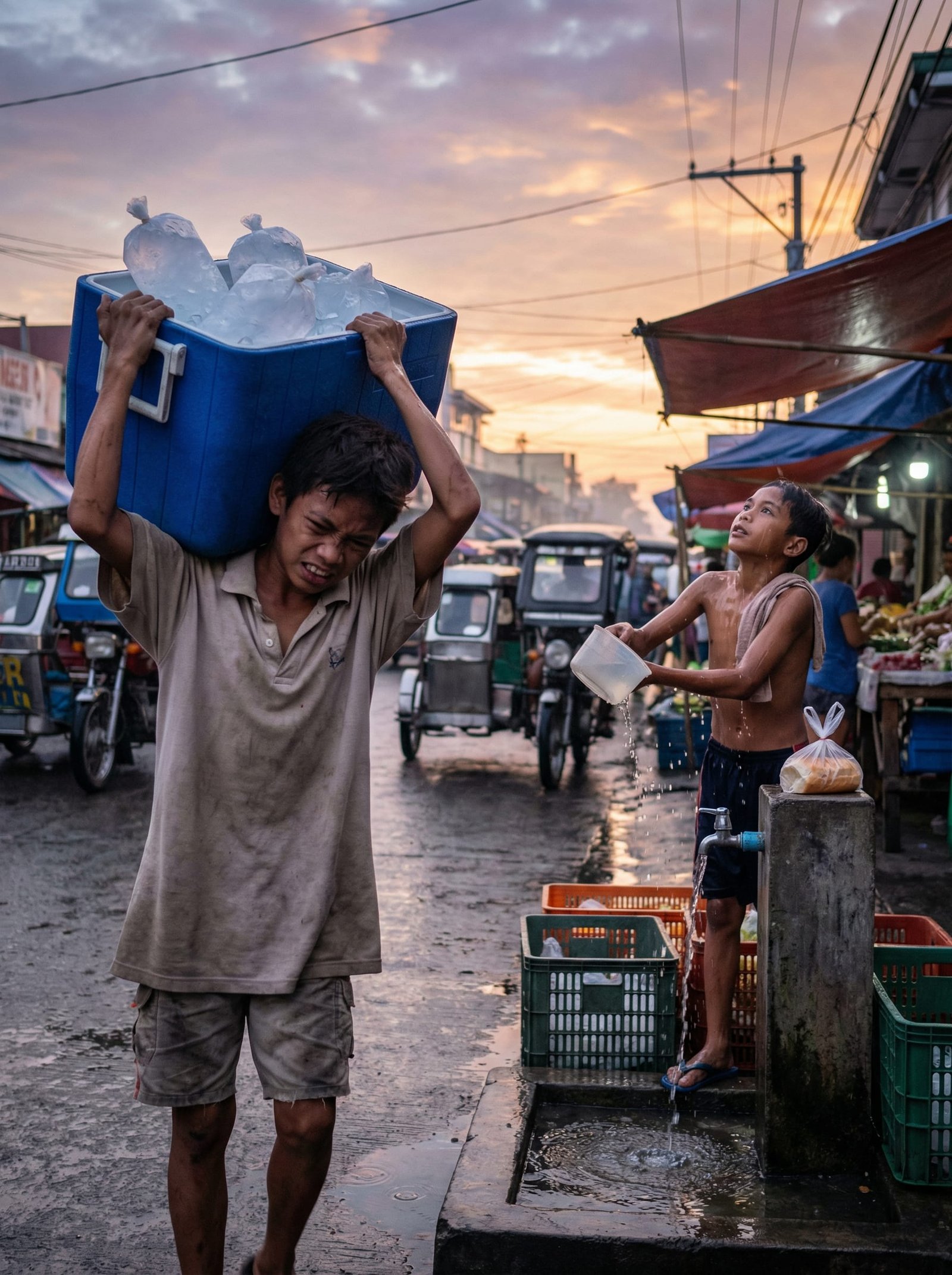 Bago pa magbukang-liwayway sa gilid ng palengke, habang ang karamihan ay himbing pa sa tulog, gising na si Jomar. Labindalawang taong gulang pa lamang siya, ngunit ang kanyang mga balikat ay tila sanay na sa bigat ng buhay. Sa isang lumang eskinita malapit sa palengke, binubuhat niya ang asul na lalagyan ng yelo na halos mas malaki pa sa kanyang katawan. Bawat hakbang ay mabigat. Bawat hinga ay may halong pagod. Ngunit wala siyang panahon para magreklamo.