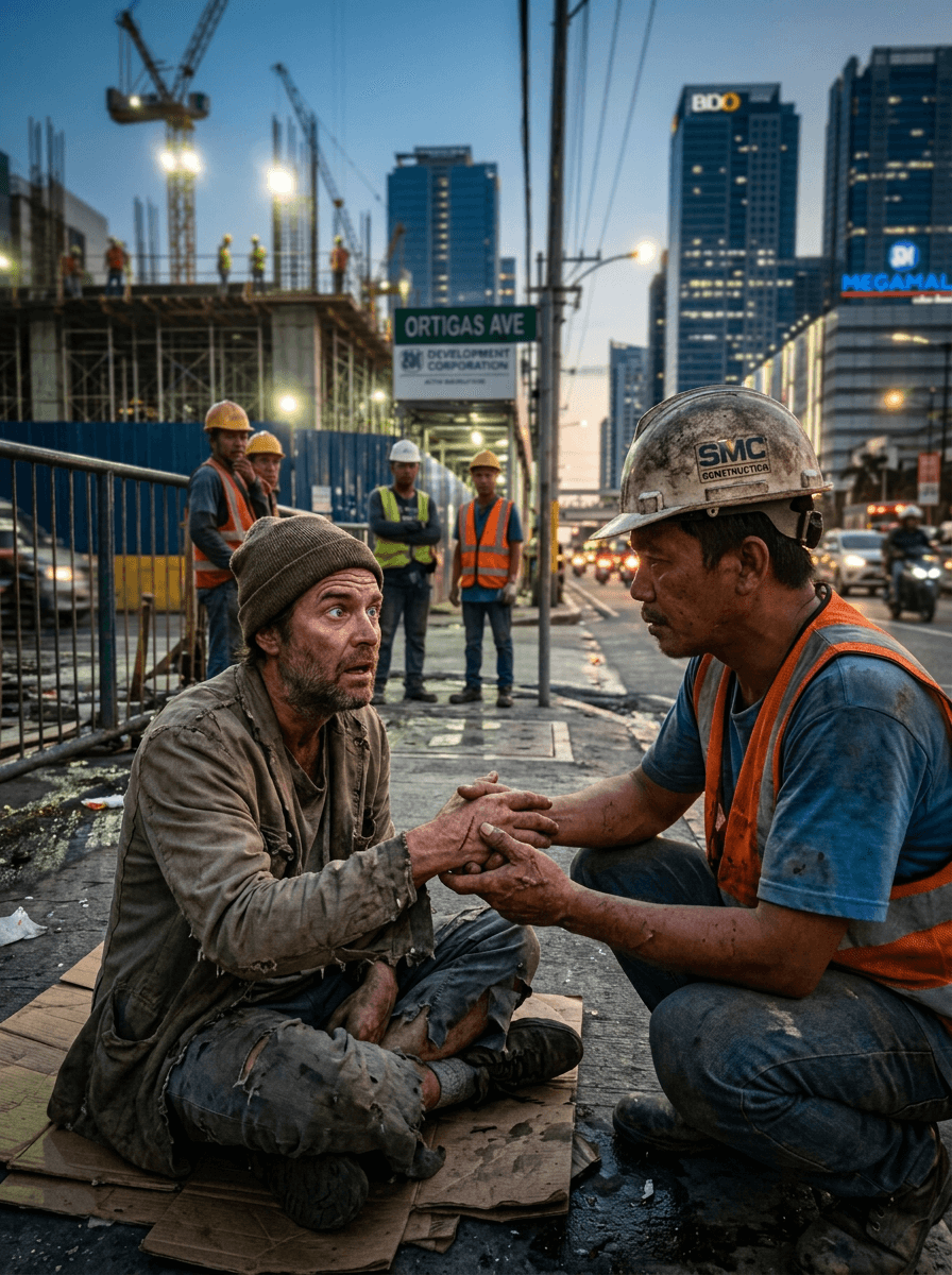 ISANG BILYONARYO ANG NAGPANGGAP NA PULUBI SA ORTIGAS PARA SUBUKAN ANG PAGKATAO—TINULUNGAN SIYA NG ISANG MADUMING CONSTRUCTION WORKER, PERO NANG HAWAKAN NIYA ANG KAMAY NITO, MAY TANDA SIYANG HINDI MAKALIMUTAN